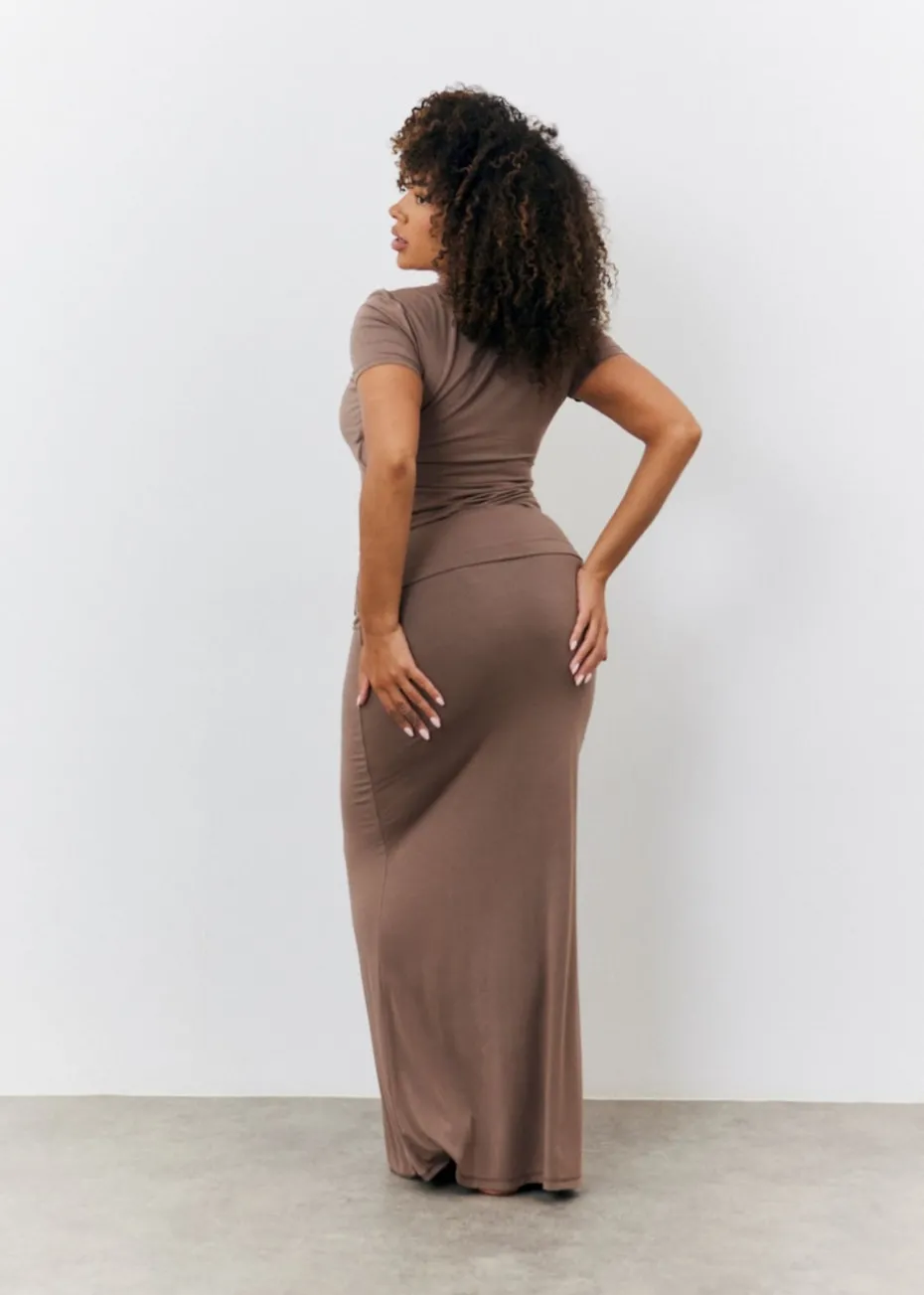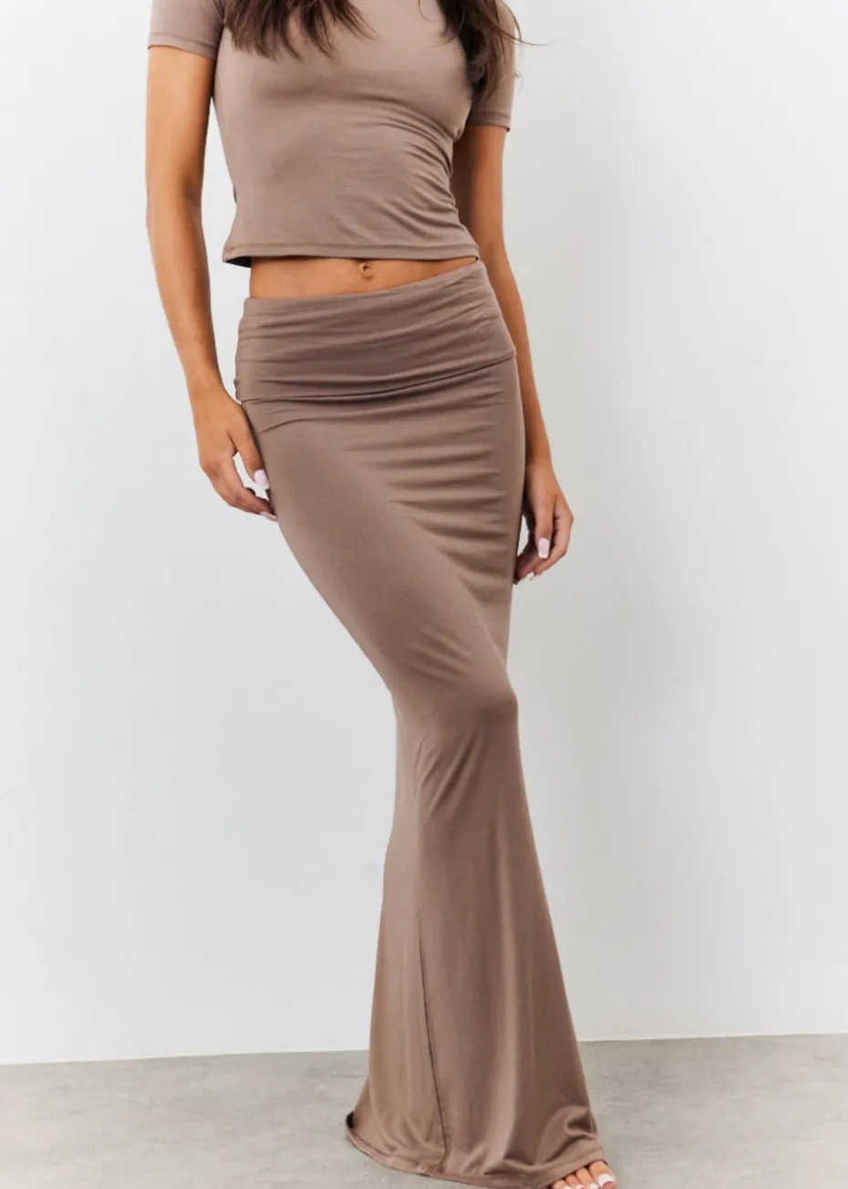 Top up your basics with our new ITS mocha high waisted maxi skirt. Pair it with the matching top for a look made for the camera.