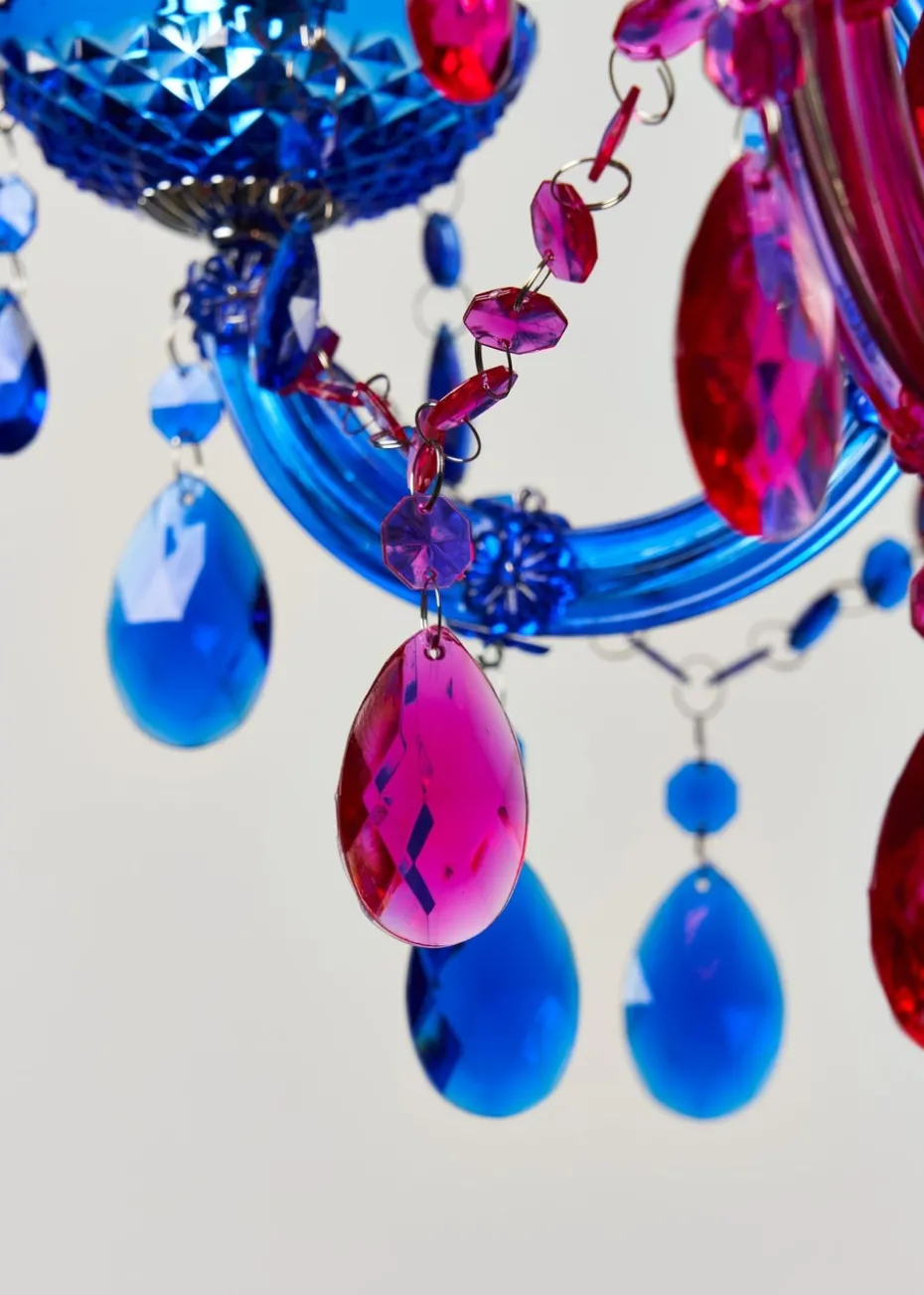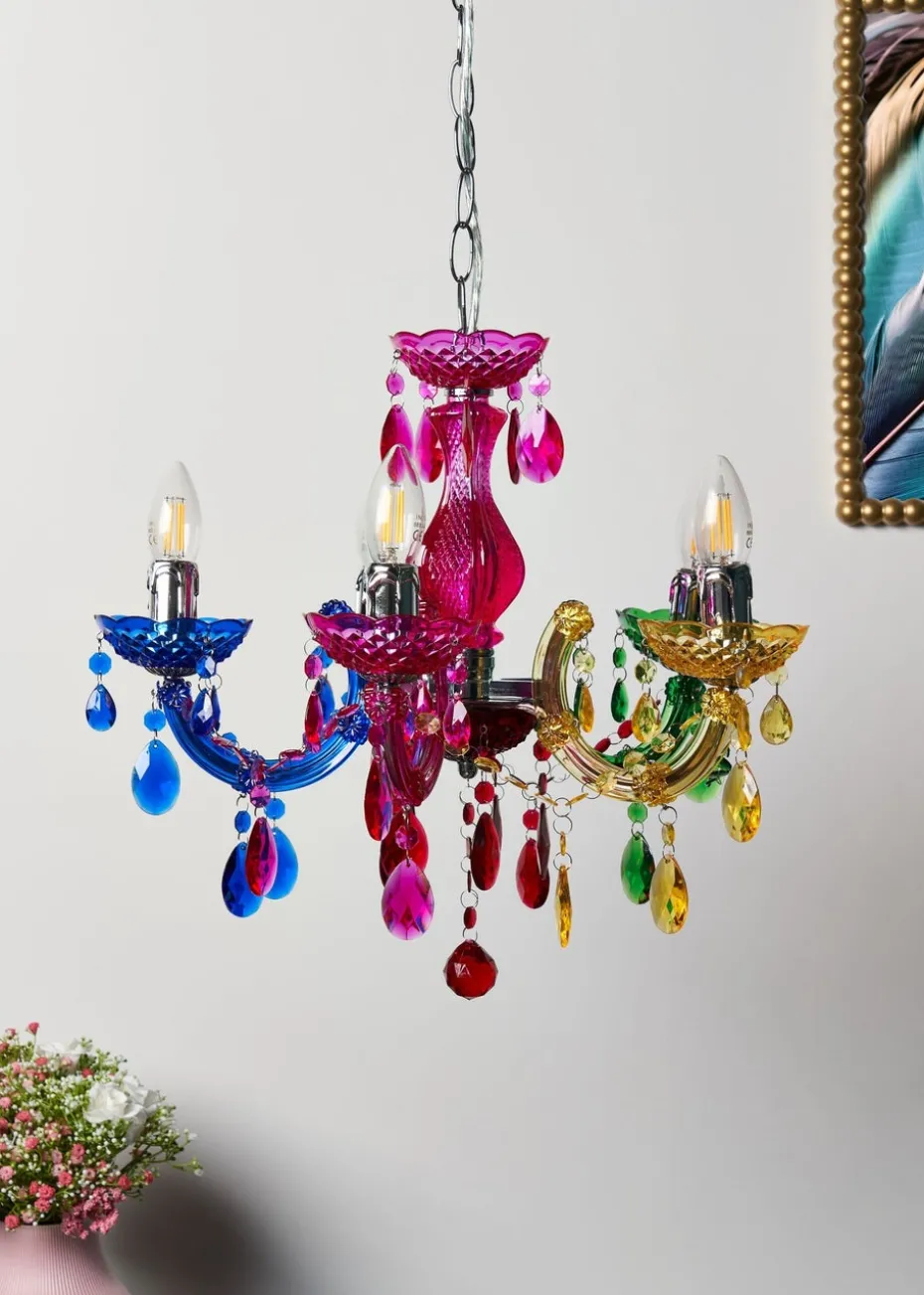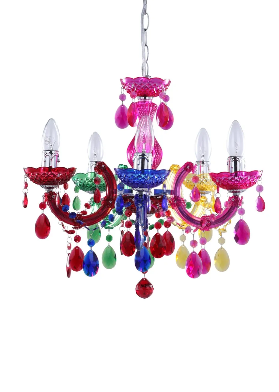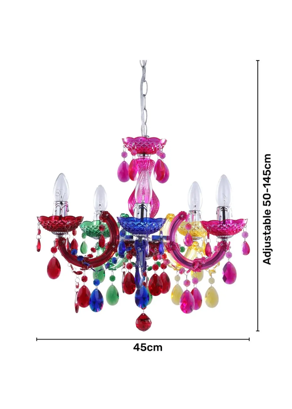 The INLIGHT Charlotte 5 Light Chandelier is an elegant and eye-catching lighting fixture that brings a touch of classic charm and vibrant color to any interior space. Inspired by the Marie Therese style, this chandelier combines traditional design elements with a contemporary multicoloured twist, making it a perfect addition to both classic and modern decor settings. Requires 5 x E14 bulbs, not included. Adjustable Height 50-145cm x Width 45cm, minimum drop 50cm.