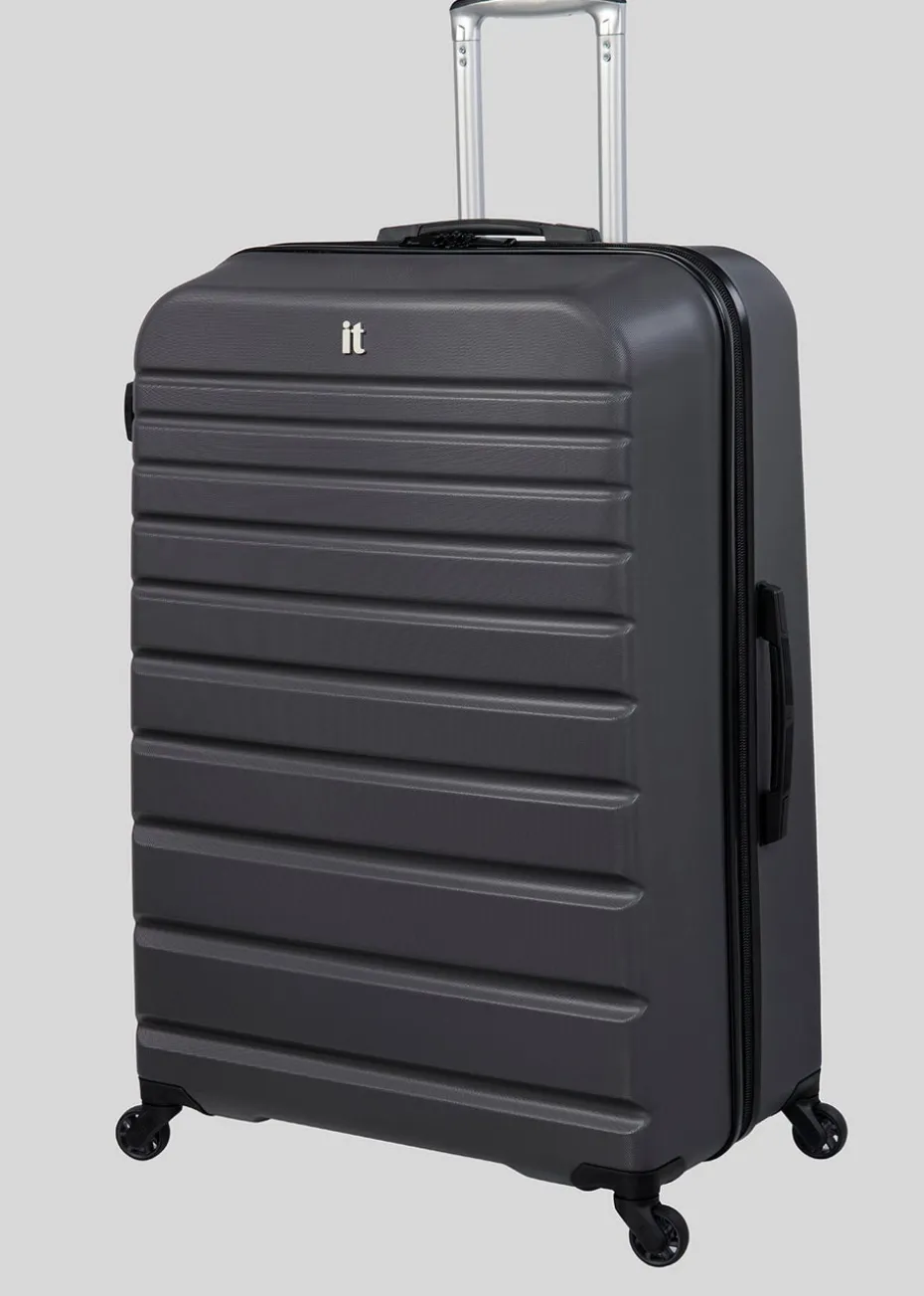 Maximise efficiency for your next summer holiday with this super practical suitcase by IT Luggage. In a dark grey hard shell design for a sturdy and durable construction, it comes with useful black carry handles to the top and side, together with an expandable handle for ease of transportation. The wheeled piece is finished with a roomy interior and a cross strap fastening for that extra bit of security and peace of mind.