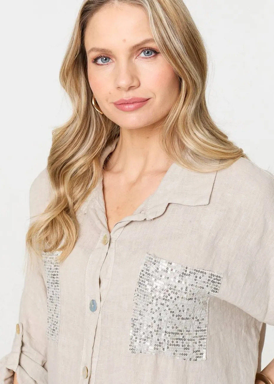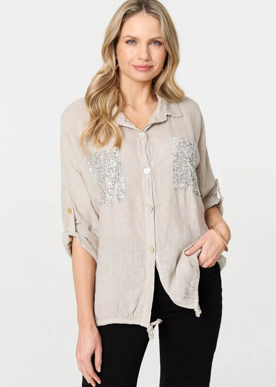 Izabel London Beige Sequin Detail 3/4 Turn-Up Sleeve Shirt