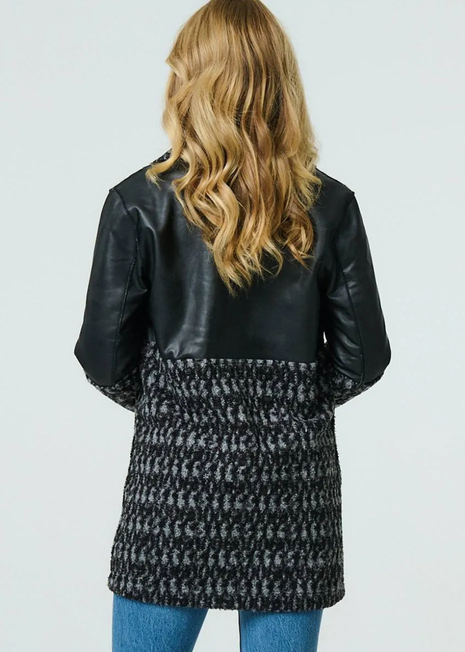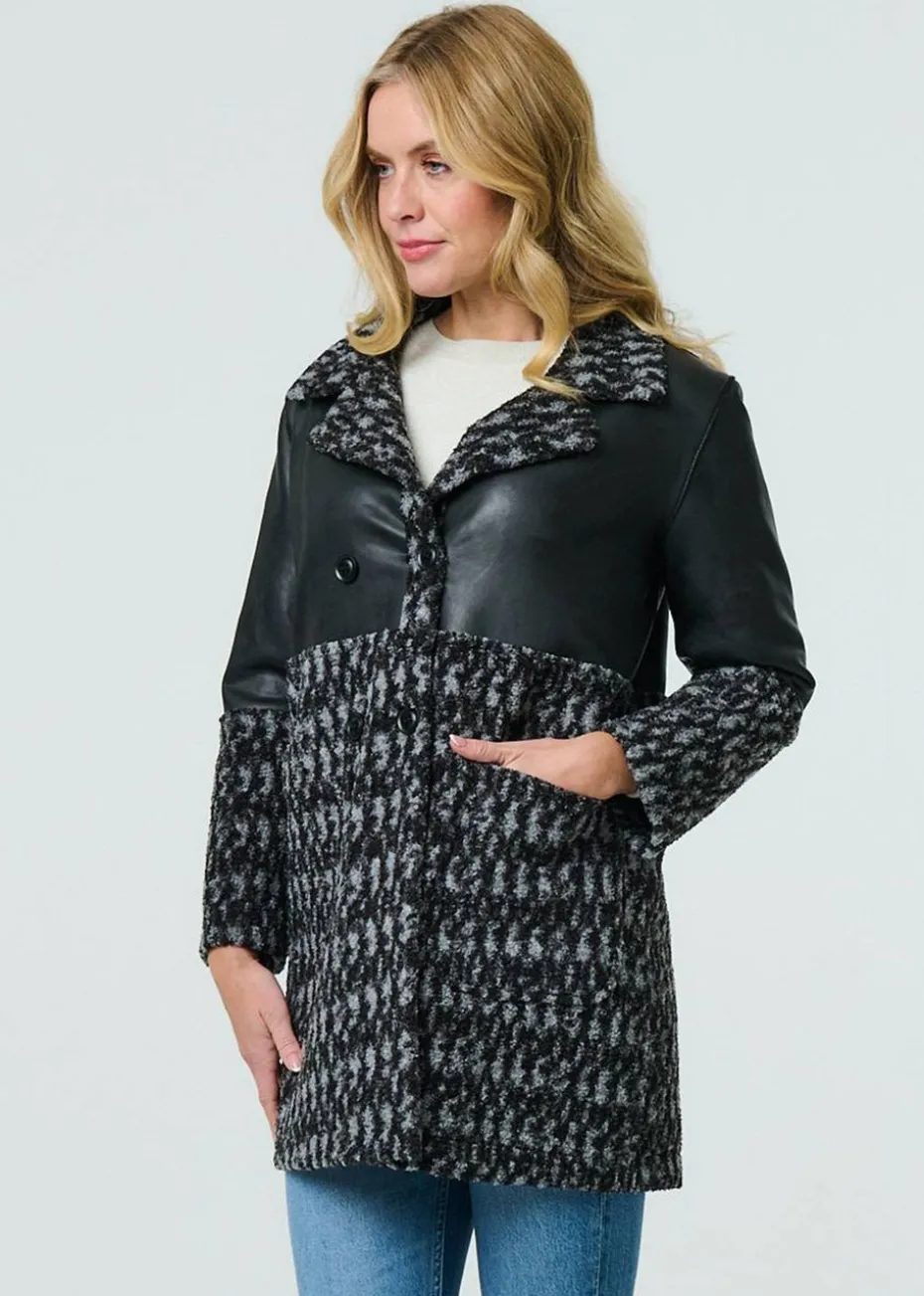 Izabel London Black Printed Faux Leather Trim Teddy Jacket