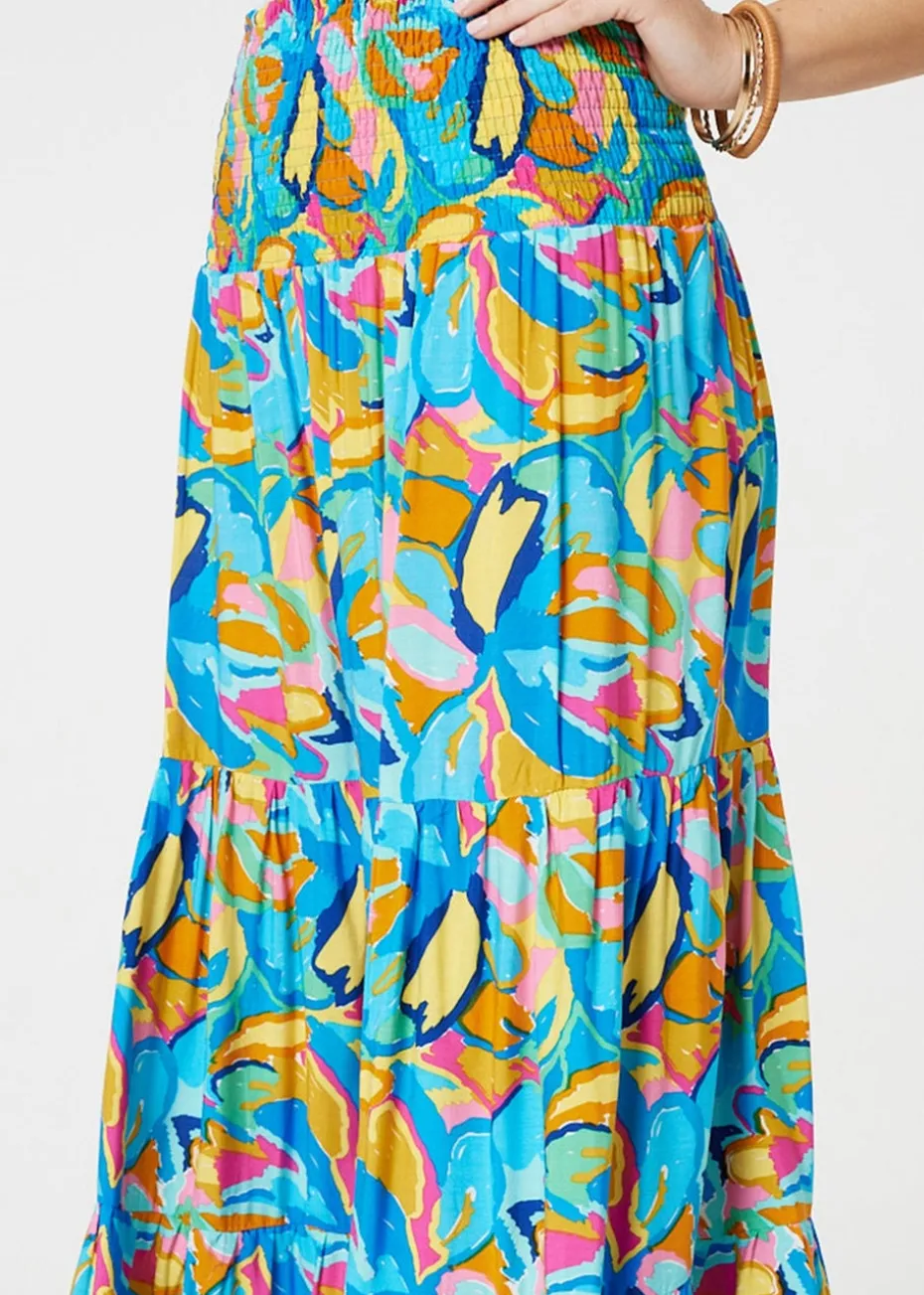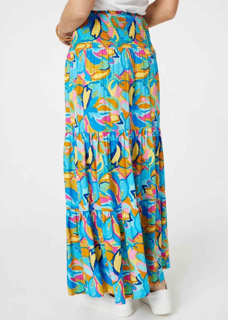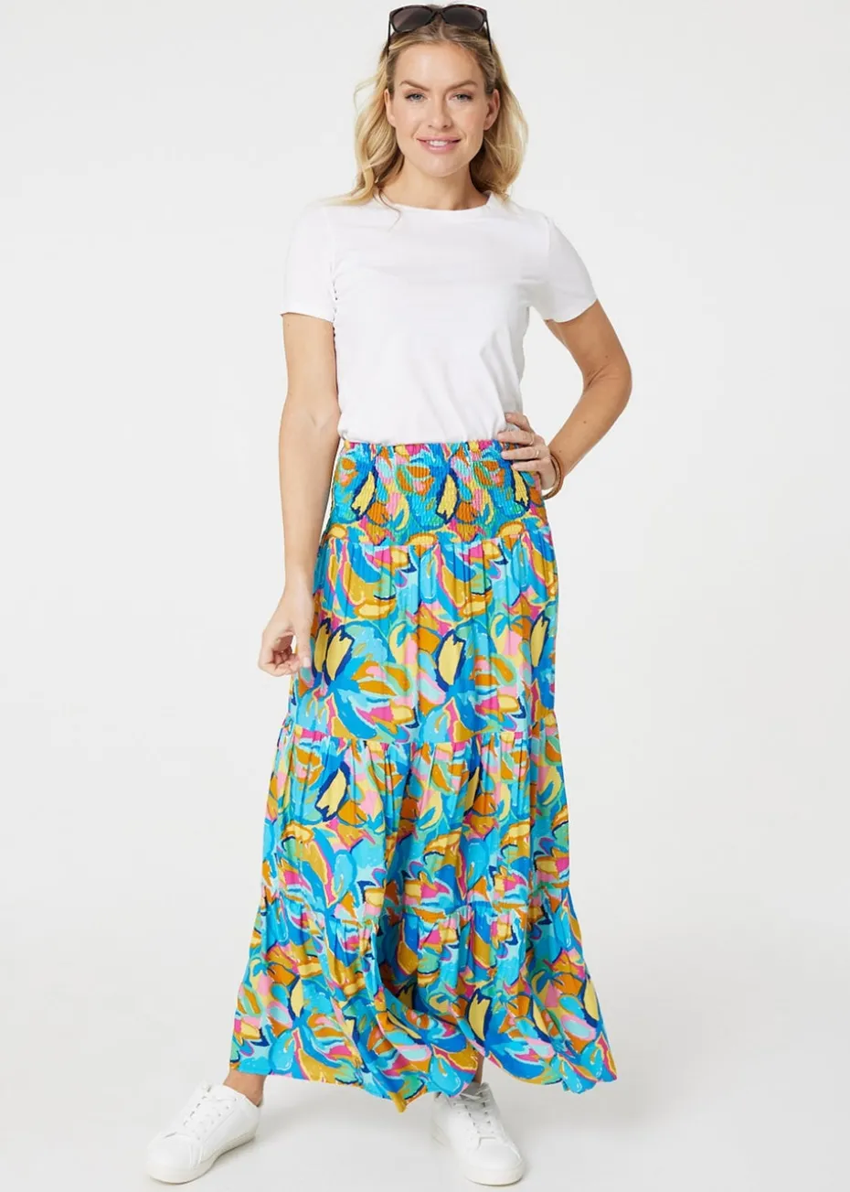 Izabel London Blue Abstract Shirred High Waist Maxi Skirt