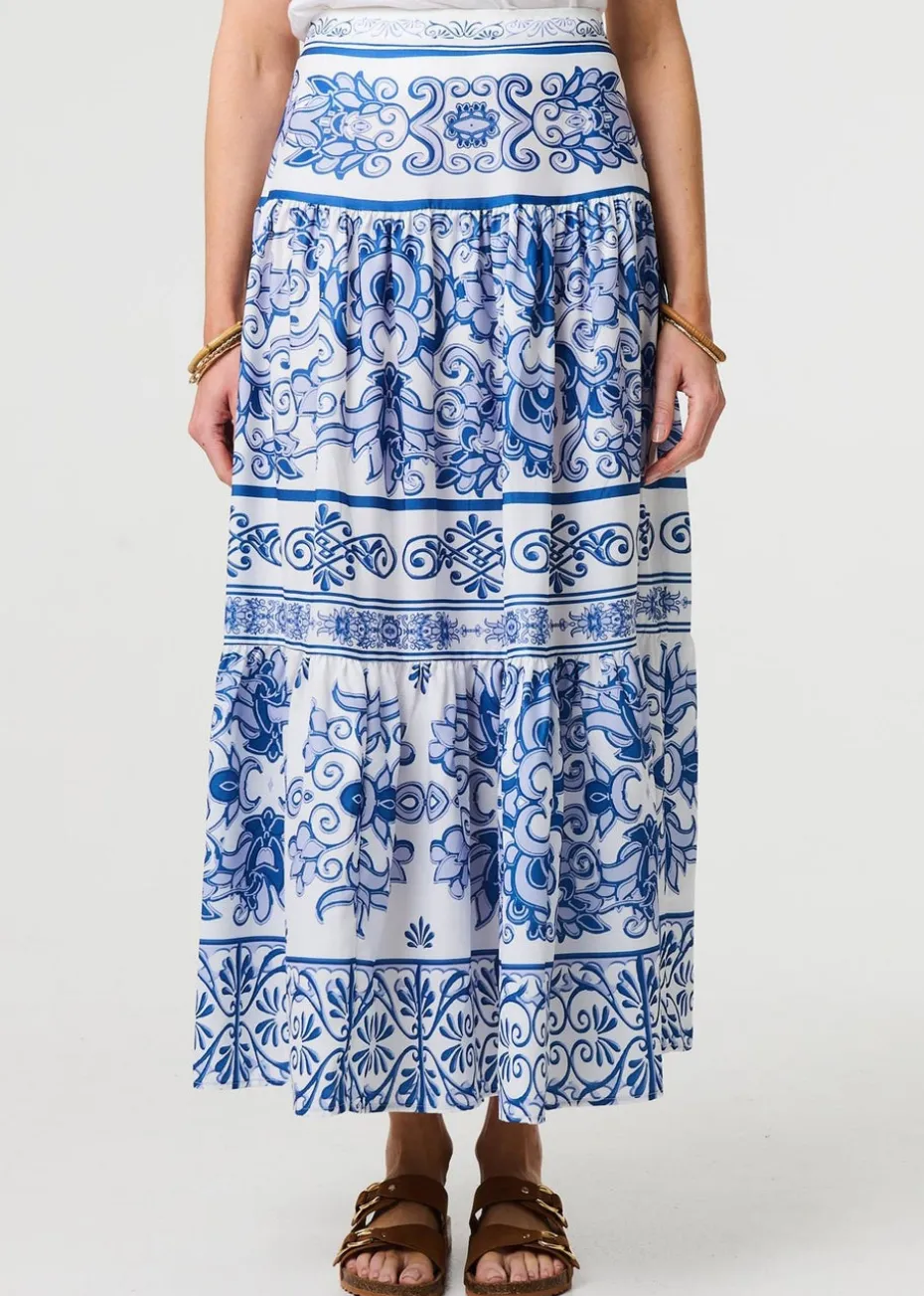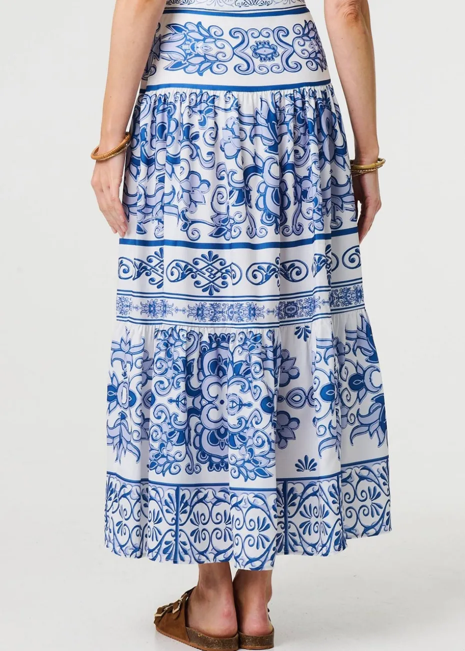 Izabel London Blue Mosaic Print High Waist Tiered Maxi Skirt
