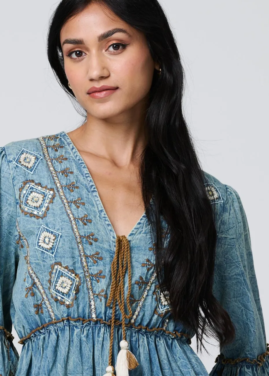 Look effortlessly stylish and laid-back in this beautiful dress. It’s made from 100% cotton denim fabric, complete with intricate embroidered details. The v-neck features a tassel tie, and the empire waist will flatter your figure. It also has 3/4 flared sleeves and a knee length hem. This dress is ideal for wearing on holiday or adding a boho-inspired touch to your wardrobe.