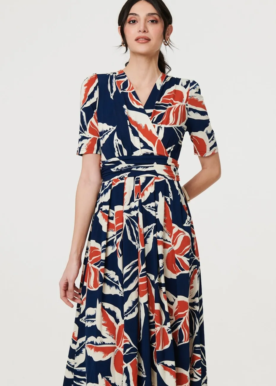 Izabel London Navy Floral V-Neck Pleated Midi Wrap Dress