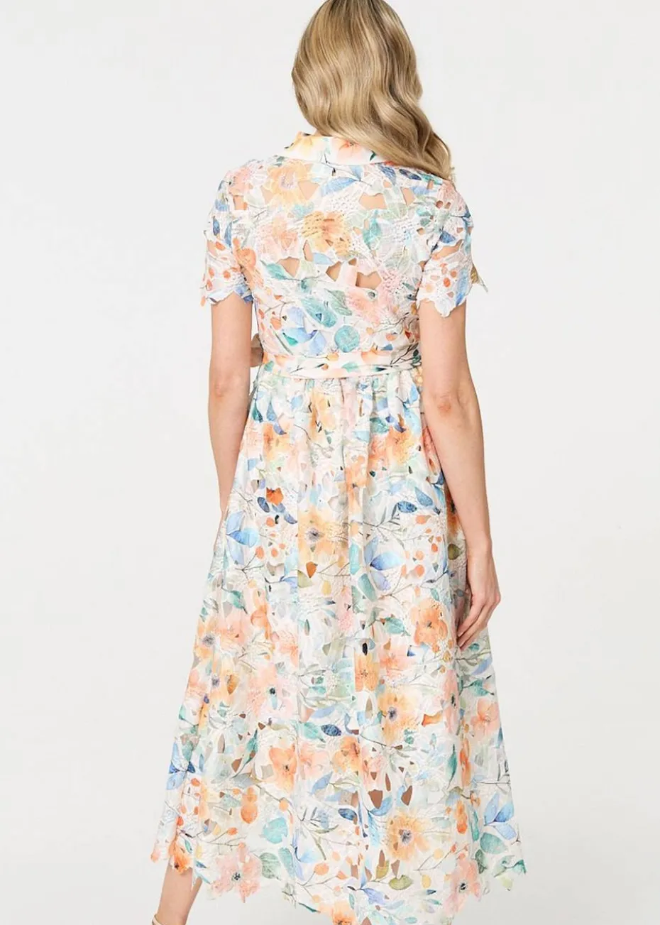 This stylish dress is perfect for smart-casual occasions. It has a tummy-flattering shape with a tie waist, short sleeves and a collar. The material has a cut out detail for an extra special finishing touch. Wear this dress with heels for formal occasions such as weddings, or try sandals for a more laid-back look.