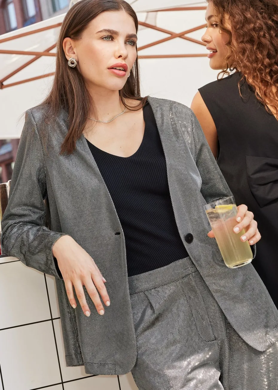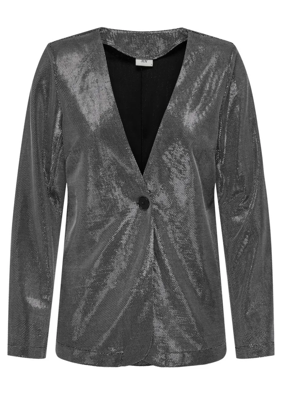 Make a dazzling entrance with the JDY Silver Glitter Blazer, a statement piece designed to elevate any outfit. This chic blazer features a sparkling silver glitter finish that adds instant glamour and sophistication to your look. With its tailored fit and classic lapel collar, it effortlessly combines elegance with bold style. Perfect for parties, evenings out, or adding a touch of sparkle to a casual ensemble, this blazer pairs beautifully with everything from dresses to jeans. Complete with long sleeves and a sleek silhouette, it’s the ultimate standout piece for your wardrobe.