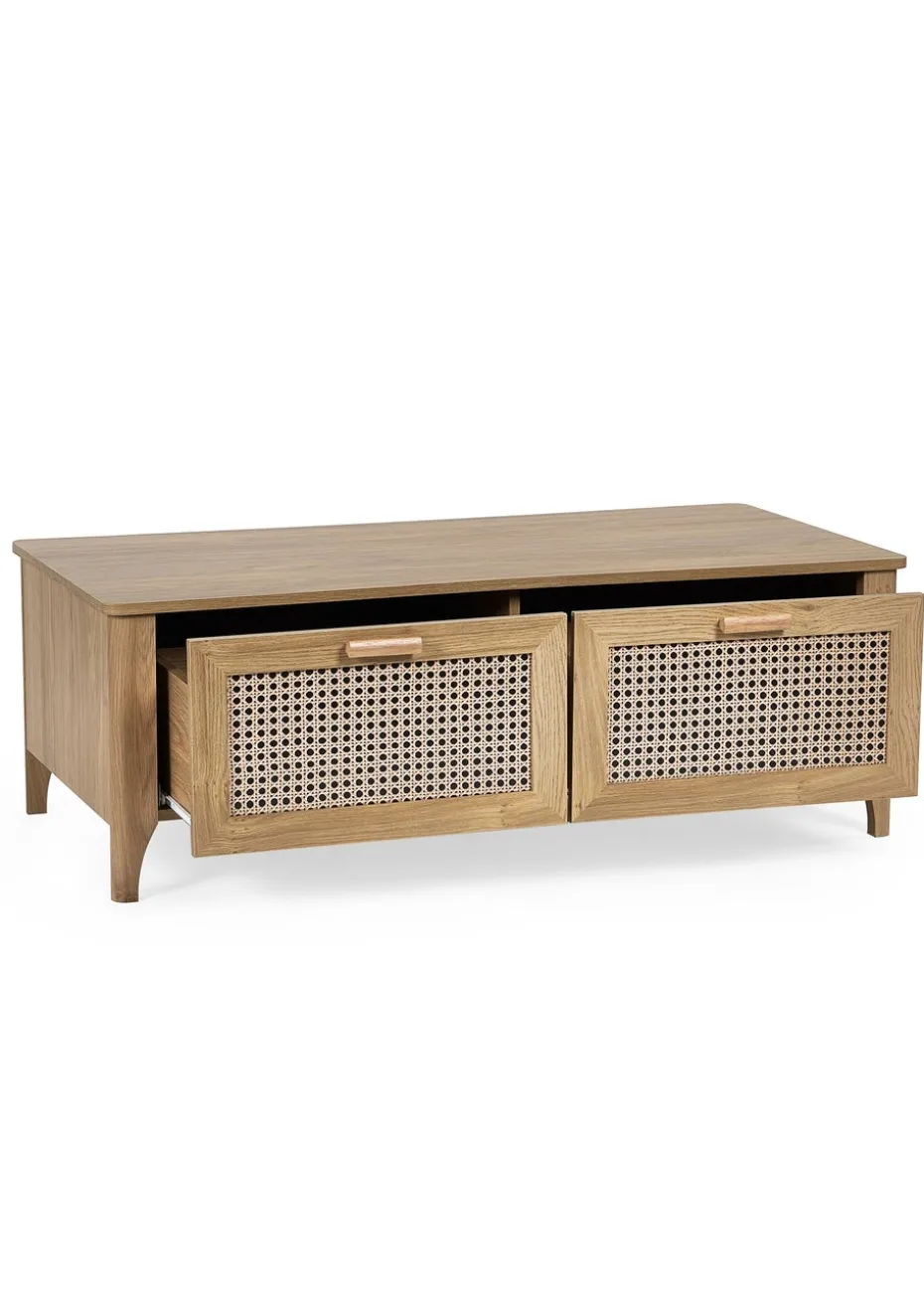 Showcasing a beautifully sleek design with a bohemian feel, the Sydney 2 Drawer Coffee Table offers exquisitely curved edging accompanied by a raised lip around the edge providing a practical addition, stunningly combined with a rattan-effect sticker front. Finished with a natural oak effect featuring two pull-out drawers to store away items discretely. All around creating the perfect airy, warm feel within your home.