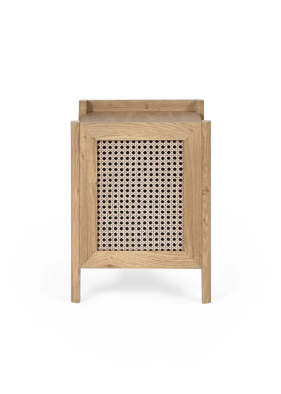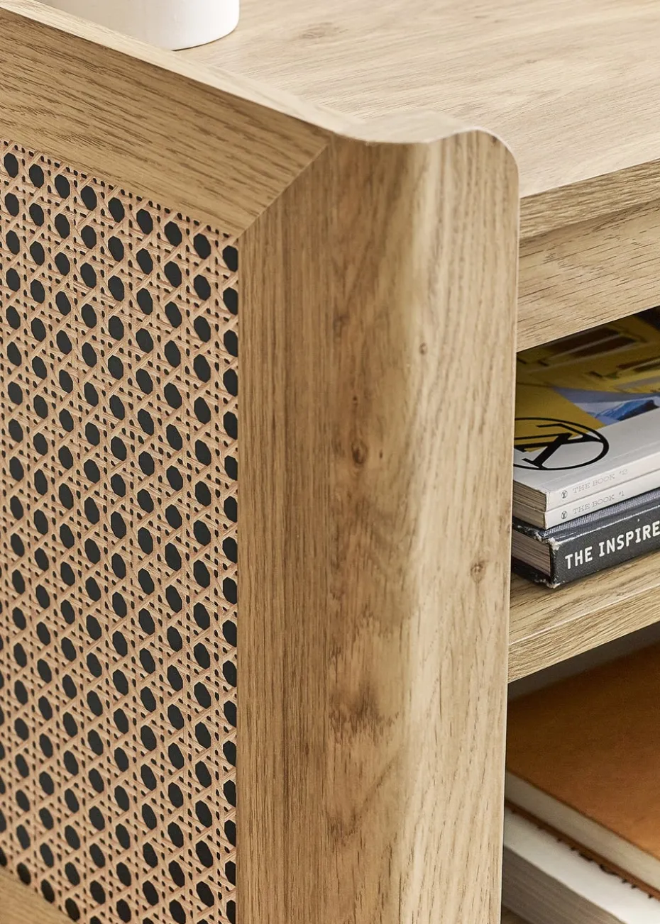 Showcasing a beautifully sleek design with a bohemian feel, the Sydney Lamp Table offers exquisitely curved edging accompanied by a raised lip around the edge providing a practical addition, stunningly combined with a rattan-effect sticker front. Finished with a natural oak effect featuring a removable shelf allowing you to store key essentials both on the top and bottom of the table. All around creating the perfect airy, warm feel within your home.