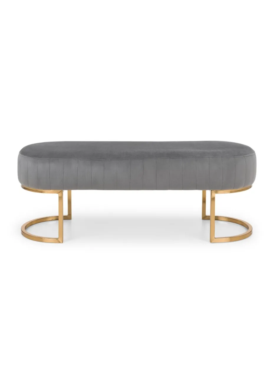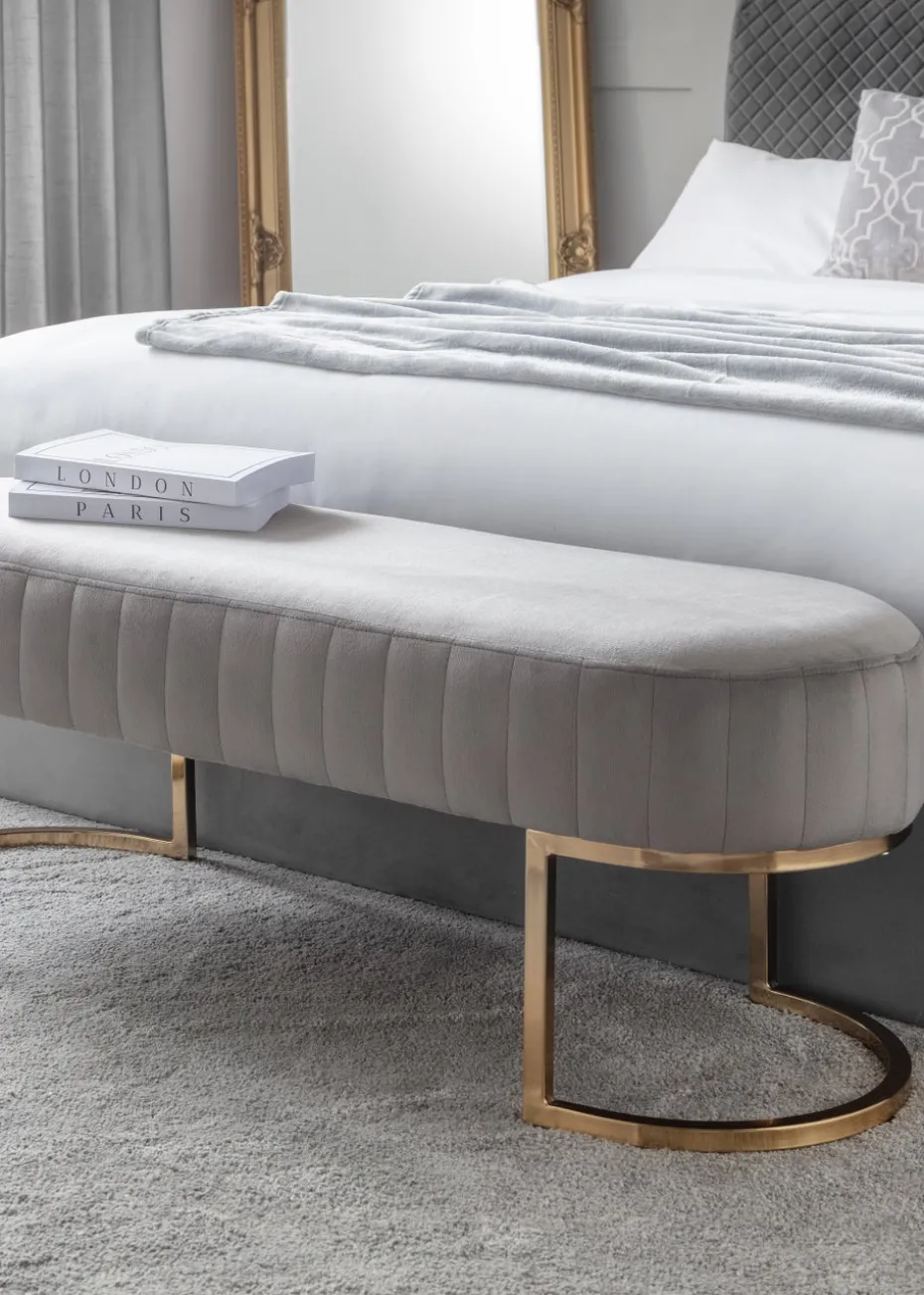 Designed in a luxury velvet, our Harrogate bench features an elegant, unique design that fits beautifully amongst a large range of interior décor styles. The contrast of the slick gold legs make this piece versatile, yet classy. Whether placed in the bedroom, or part of the hallway, this piece is sure to be a showstopper in any home.