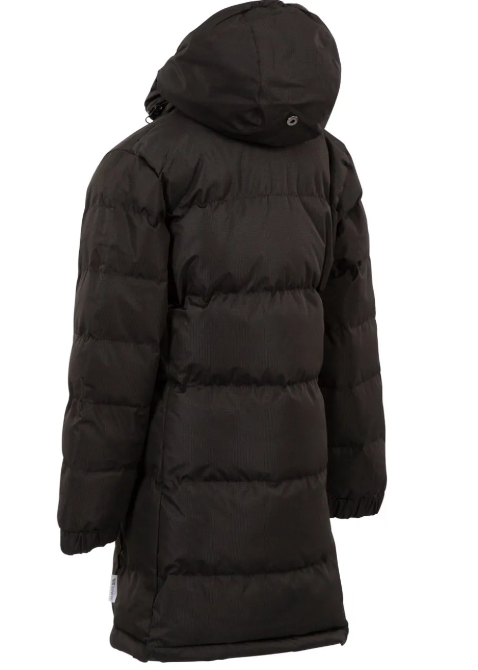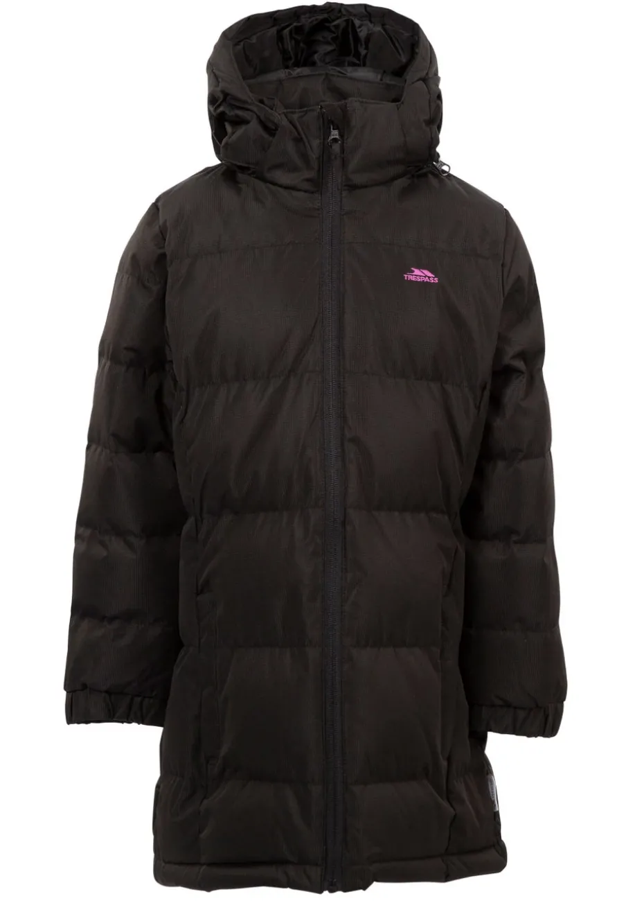 Make sure your young one is wrapped up warm for their next adventure with this soft padded jacket from Trespass. Styled in black and featuring a pretty pink brand logo to the chest, this long coat is finished with a zip up front, together with a protective hood that’s completed with adjustable toggles.