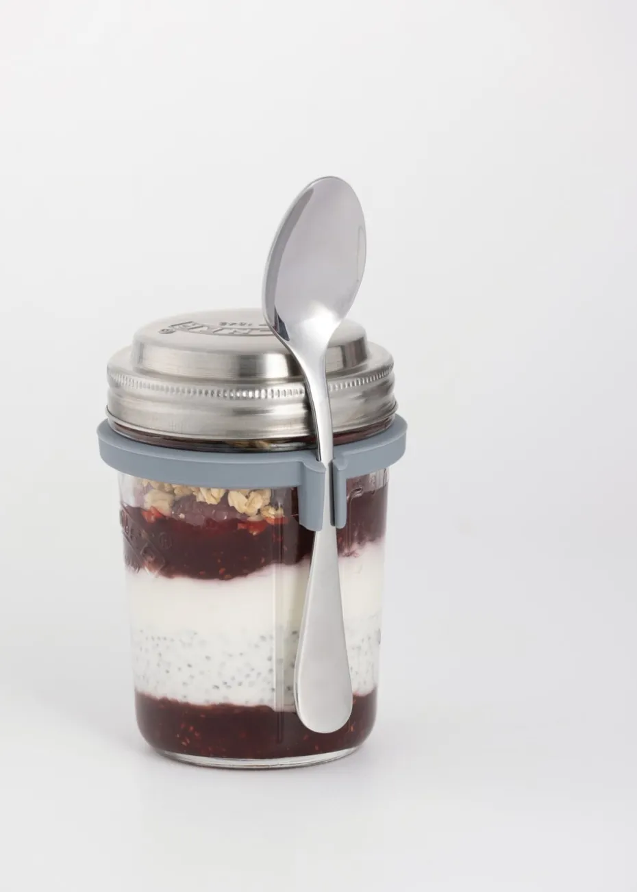 The KilnerĀ® 0.35 Litre Breakfast Jar Set of 2 is a unique way to store and enjoy foods such as yoghurt, cereal and overnight oats whether at home or on-the-go. Included in the set is a KilnerĀ® 0.35 Litre Jar with a wide opening making it easy to eat from. The durable stainless steel lid doubles as a measuring cup with a capacity of 50g for better portion control. A silicone sealing disc is included to prevent and spills during transportation and keeps the contents fresher for longer if storing in the fridge. The innovative silicone band keeps the VinersĀ® Stainless Steel Spoon firmly in place when on the move. Complete with a full colour gift box including a recipe and step by step instruction booklet making an ideal gift. The glass jar is safe to use in the dishwasher. All metal and silicone components are to be washed and dried by hand in warm soapy water. Set contains: 2 x 0.35 Litre KilnerĀ® Wide Mouth Jars 2 x Stainless Steel VinersĀ® Spoons 2 x Silicone Spoon Holders 2 x Silicone Sealing Discs 2 x Recipe and Instruction Booklets ORIGINAL AND THE BEST – Each jar is made from high quality sodalime glass material with pristine clarity and consistent wall thickness ensuring no weak points. GLASS IS BEST AND SUSTAINABLE – Glass is best for storing food and drink. It is made from natural ingredients so no harmful chemicals or toxins can leak into the food. Glass is BPA free and does not absorb odours, flavours or stains. Not only is glass a healthier option, it is made to last and never for single use. KilnerĀ® continues to tackle plastic waste with our ethos of REUSE, REFILL, RECYCLE.