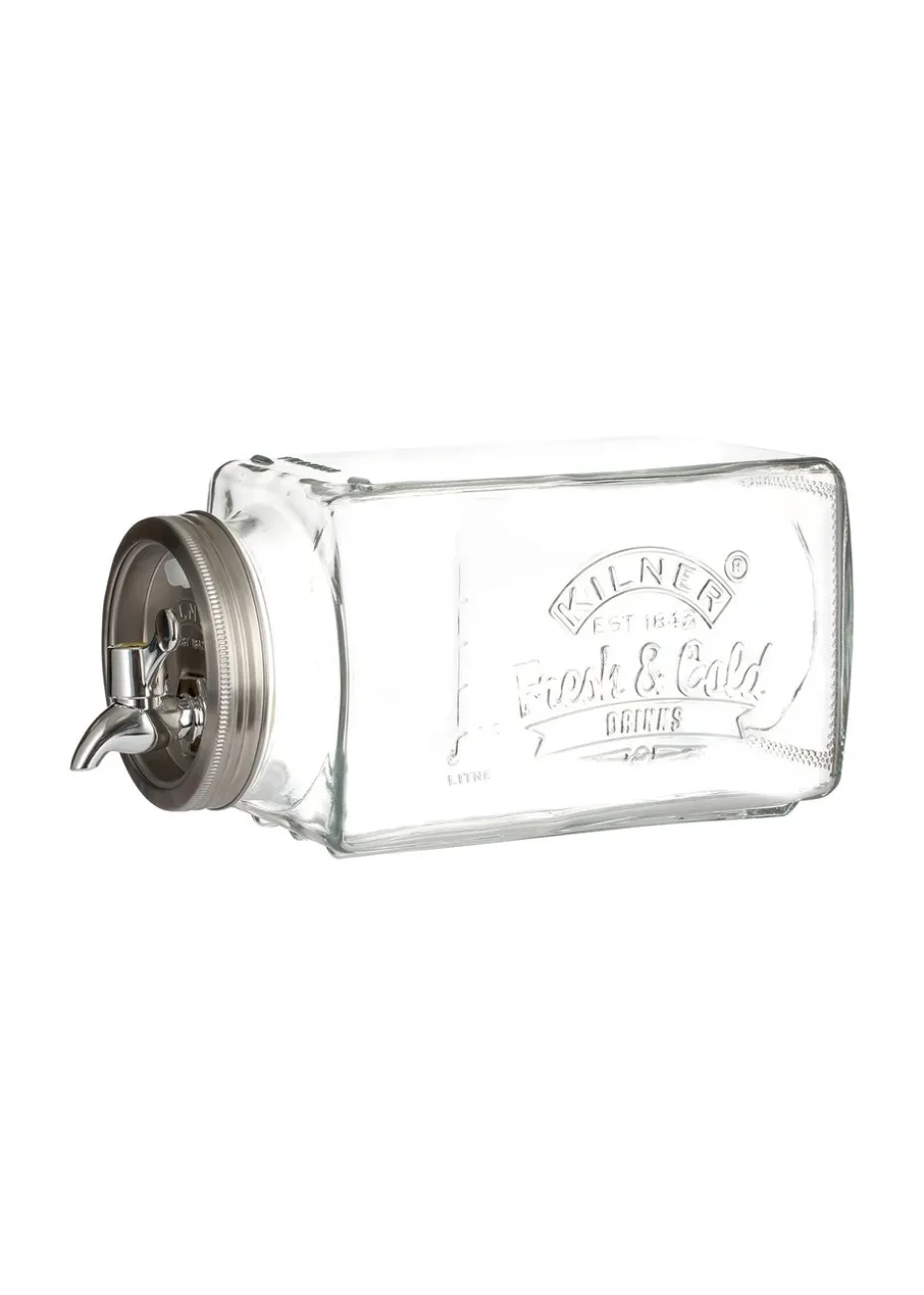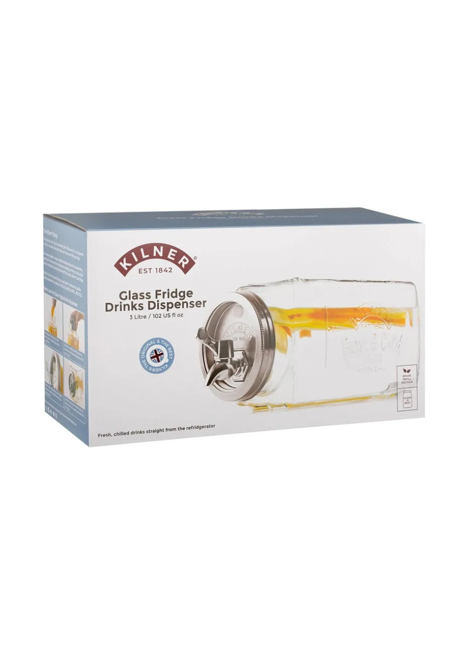 FRIDGE DISPENSER – The KilnerĀ® 3 Litre Fridge Drinks Dispenser is perfect for keeping drinks cold in the fridge. Ideal for Juices, infusing and creating flavoured waters or simple healthy ice cold water. With a 3 litre capacity (the suggested consumption of water per day) and a helpful measuring scale down the side, this dispenser makes tracking daily water intake simple. Featuring an easy pour tap that will keep drinks flowing and an elegant rectangular shape, designed specifically to maximise space on your fridge shelves. A step by step instruction leaflet is included. Packaged in a full colour gift box, ideal for gifting. The set contains: 1 x KilnerĀ® 3 Litre Glass Dispensing Jar 1 x Stainless Steel Sealing Disc 1 x Stainless Steel Screw Band 1 x ABS Pouring Tap ORIGINAL AND THE BEST – This dispenser jar is made from high quality sodalime glass material with pristine clarity and consistent wall thickness ensuring no weak points. Not suitable for use in the dishwasher Not suitable for carbonated liquids GLASS IS BEST AND SUSTAINABLE – Glass is best for storing / preserving and transporting food and drink. It is made from natural ingredients so no harmful chemicals or toxins can leak into the food. Glass is BPA free and does not absorb odours, flavours or stains. Not only is glass a healthier option, it is made to last and never for single use. KilnerĀ® continues to tackle plastic waste with our ethos of REUSE, REFILL, RECYCLE. THE KILNERĀ® STORY – The original KilnerĀ® Jar, invented by John Kilner and Co. in England is as much loved and successful now as it was over 180 years ago. Our diverse product range provides simple solutions for preserving, food preparation, storage and eating on-the-go using high quality materials all authenticated with the iconic KilnerĀ® brand logo.