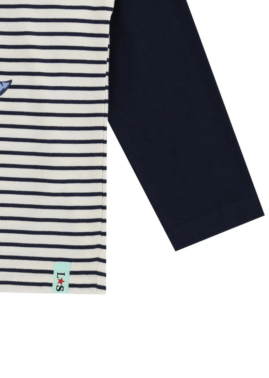 In the classic navy and white stripe, this long-sleeve children’s top features our cute dinosaur print. Crafted from ultra-soft 100% GOTS-certified organic cotton, it offers comfort perfect for outdoor play or cozy sofa snuggles on colder days. Ideal for those crisp days when comfort and style go hand in hand.