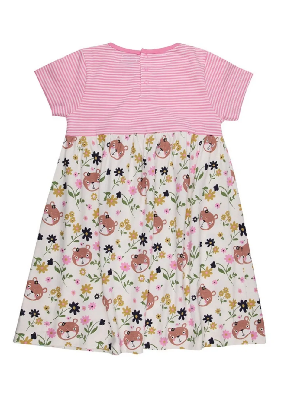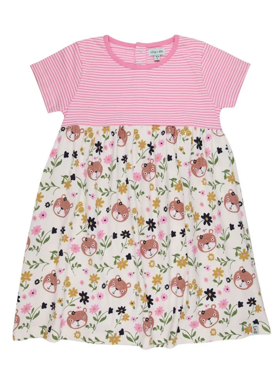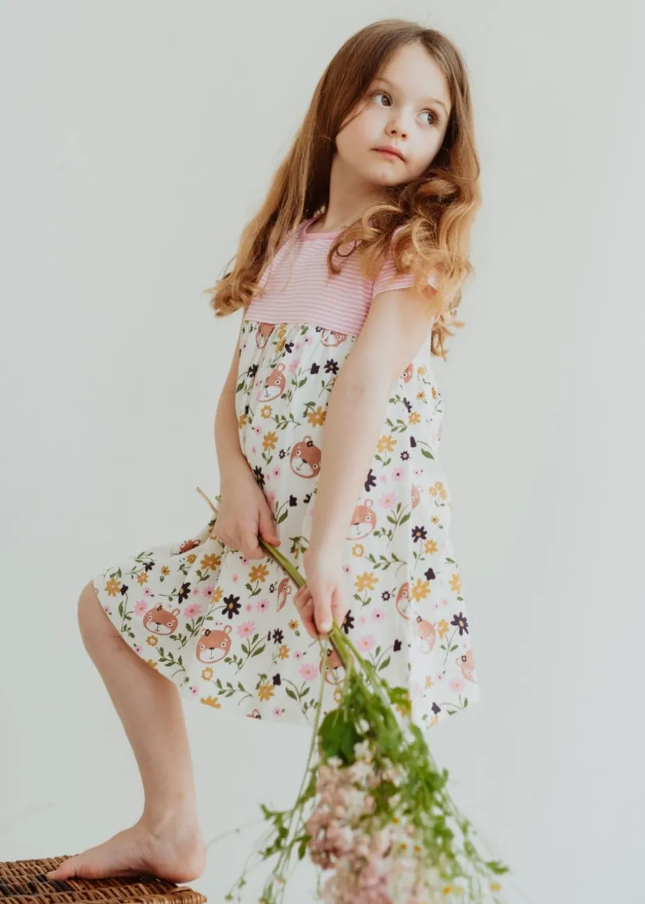 Designed with longevity & sustainability in mind, this shortsleeve kids dress featuring our pink stripe pattern and lilly print is nonseasonal and kind to our environment.