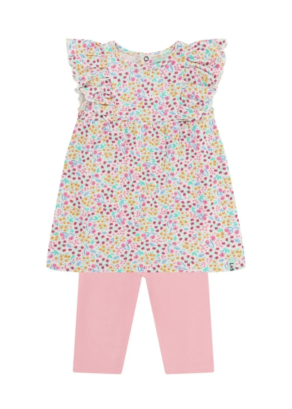 The colorful mini floral print features a frill bodice for easy changes and beach day parties. Paired with coordinating pink leggings, this set brings comfort and playfulness.