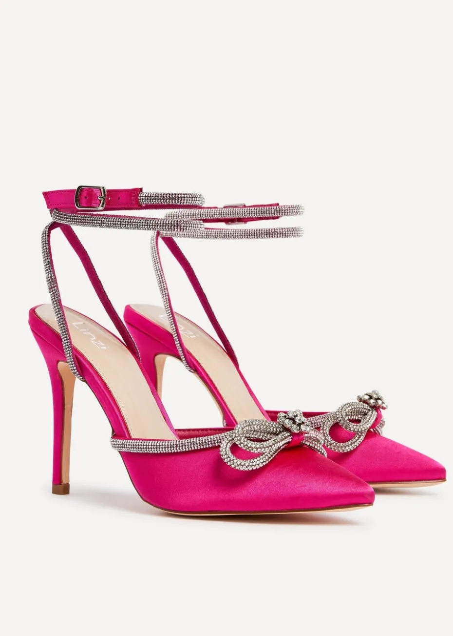 Satin Classic Court Heel Style Embellished Double Bow Front Detail Embellished Wrap-Around Ankle Strap Pointed Closed Toe Heel Height 10cm / 3.93 inches.