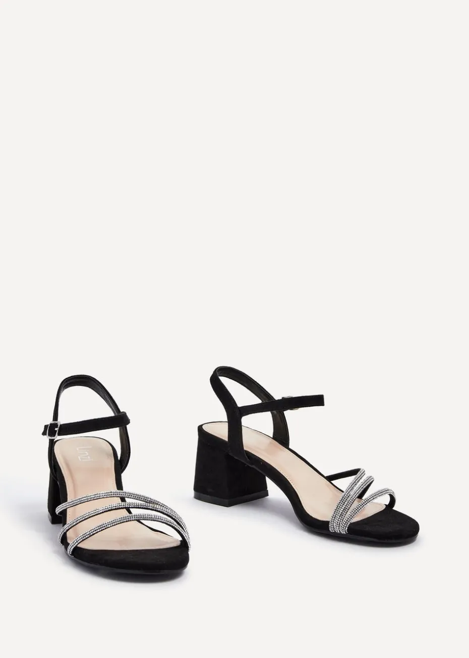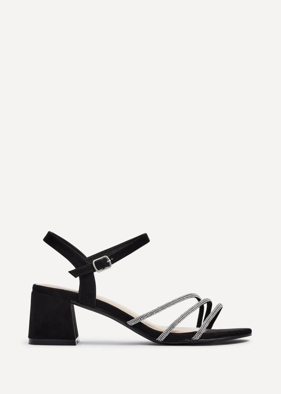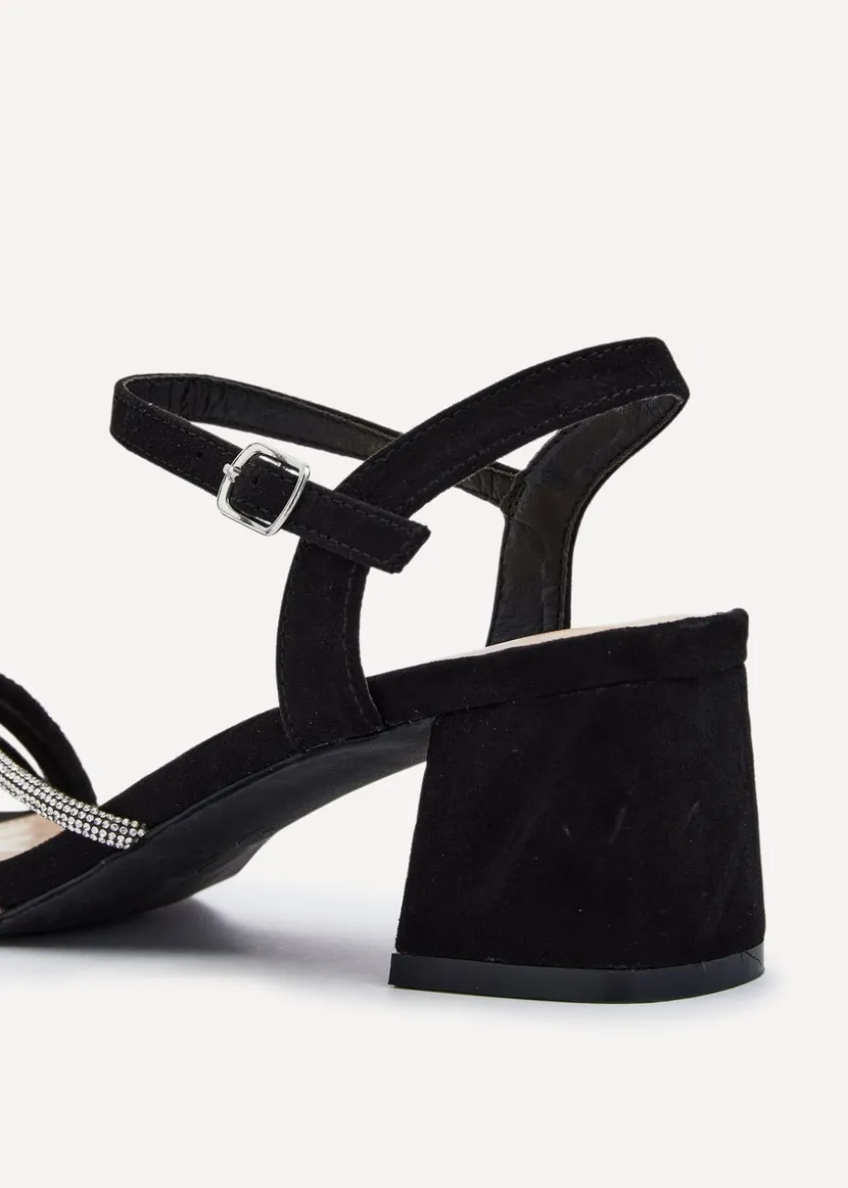Luxurious faux suede with three front straps covered in sparkling diamantes, these open-toe & back block heeled sandals boast a 5.5cm/ 2.16 inch heel for a sultry, show-stopping look.