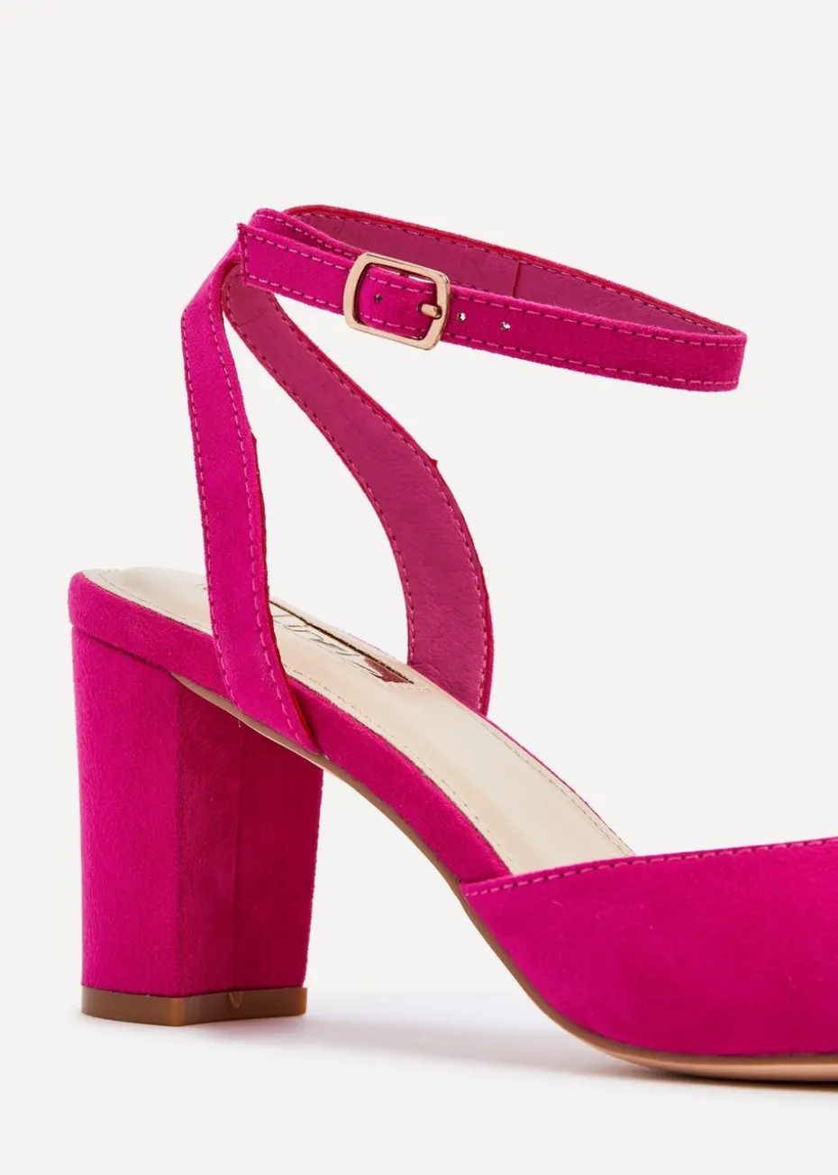 Sink your feet into luxe-looking faux suede for a court-heel style that’s anchored by an ankle strap and open back. Stack up the style with 7cm of block-heel..