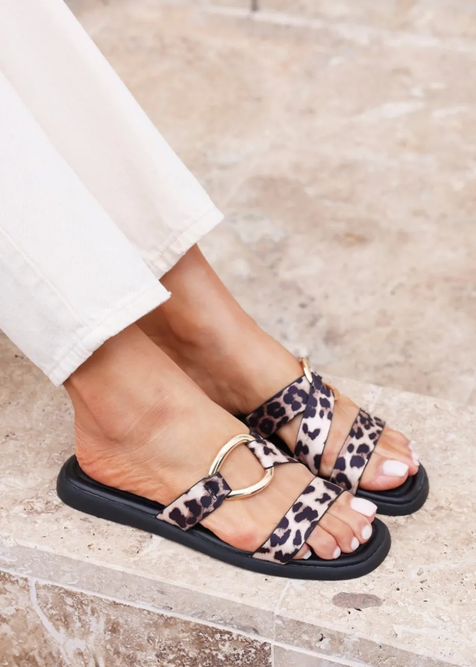 Step up your style game with our Cassandra double strap sandals. These sandals combine comfort and style, featuring a slip-on design with two straps across the foot and a metallic buckle detail. Complete with a cushioned footbed for all day comfort, making them a must have sandal this summer..