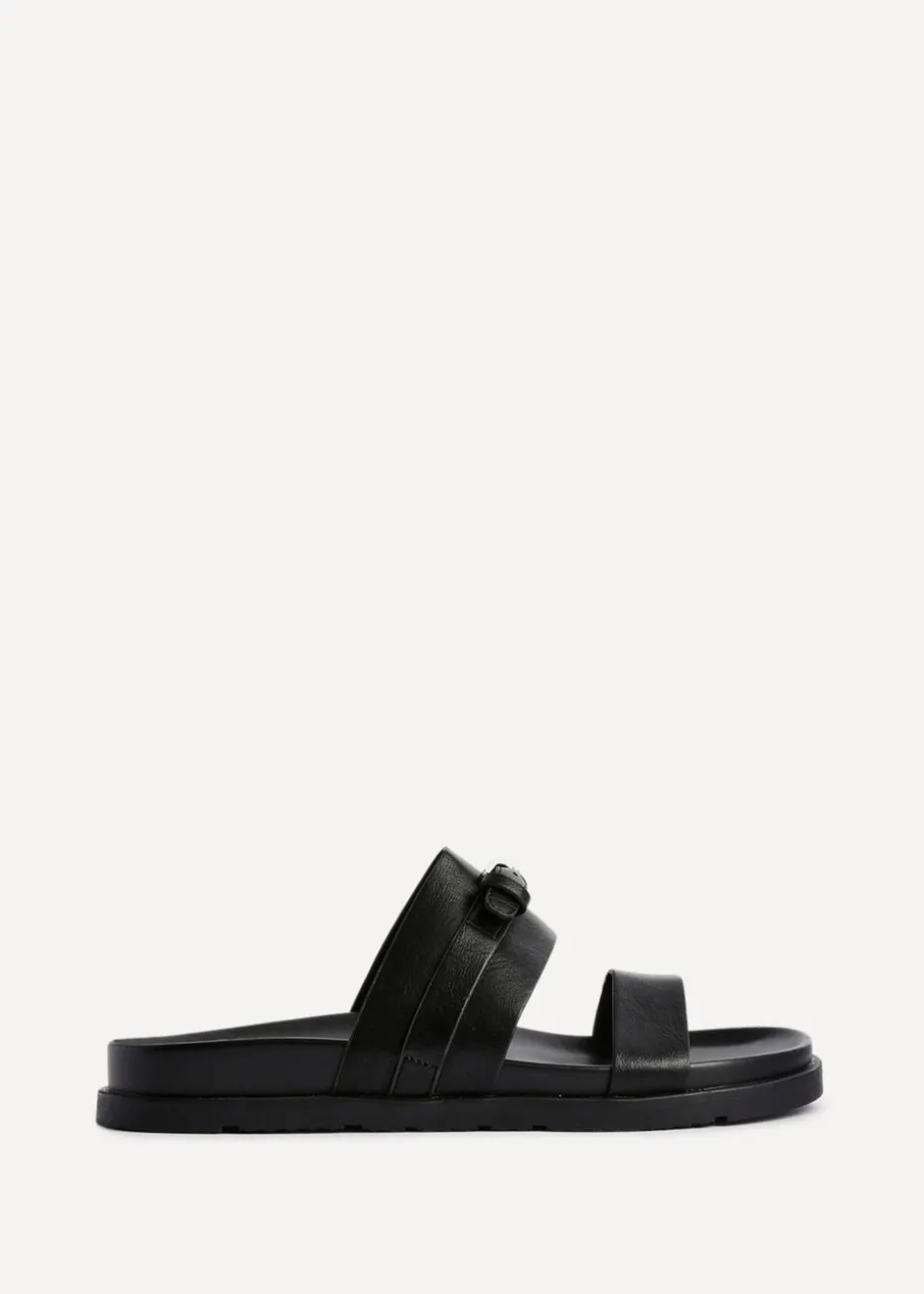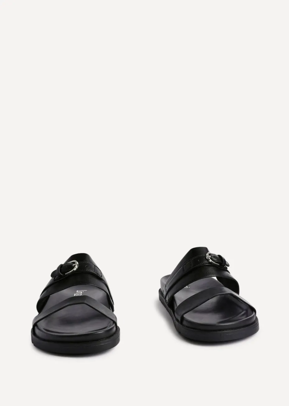 Indulge in sophistication with our Ezra flat slider sandals. Featuring double straps with a chic buckle detail, these sandals exude effortless style. Perfect for transitioning from the beach to the bar or for busy days out, the expertly crafted moulded footbed guarantees all day comfort.