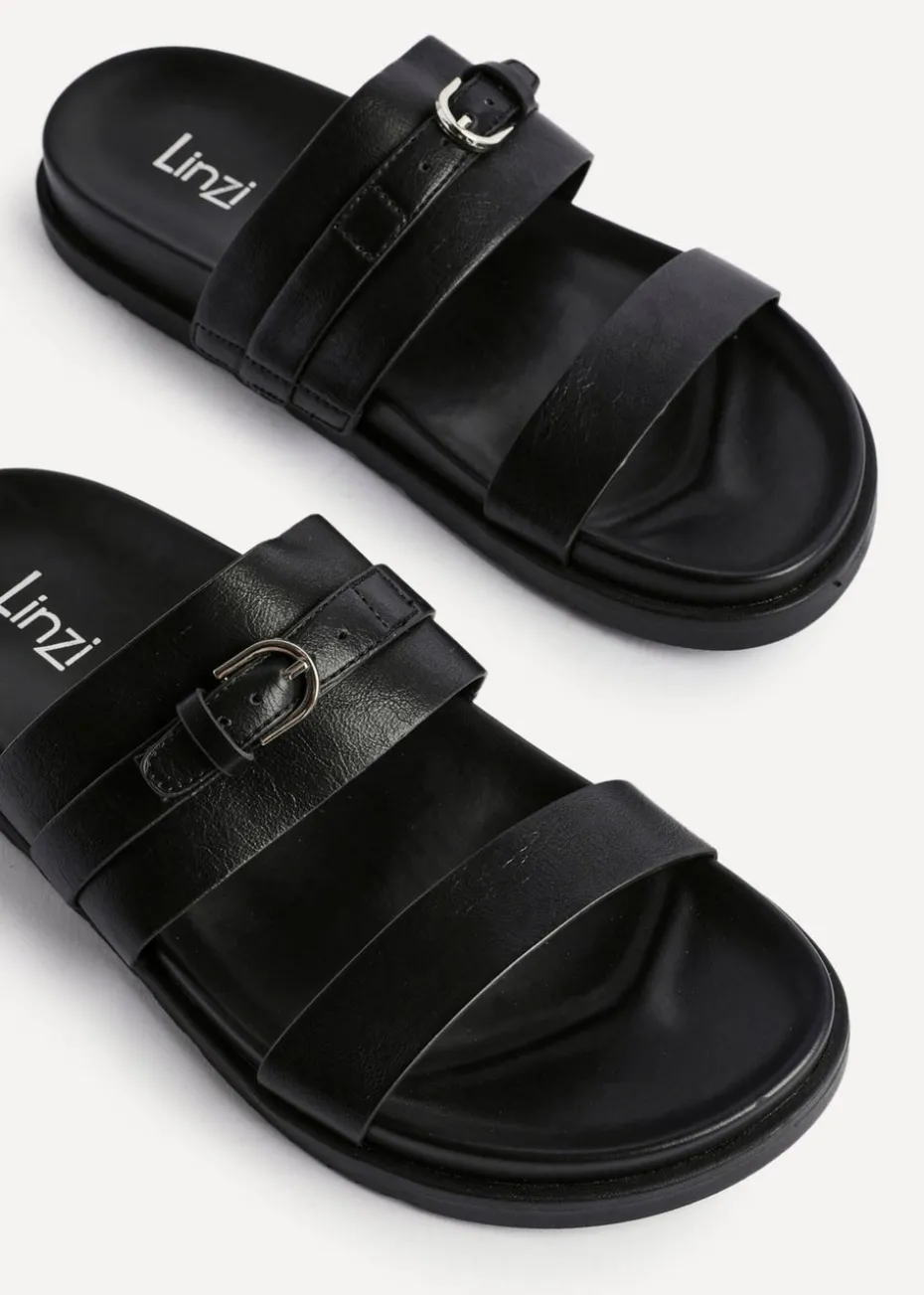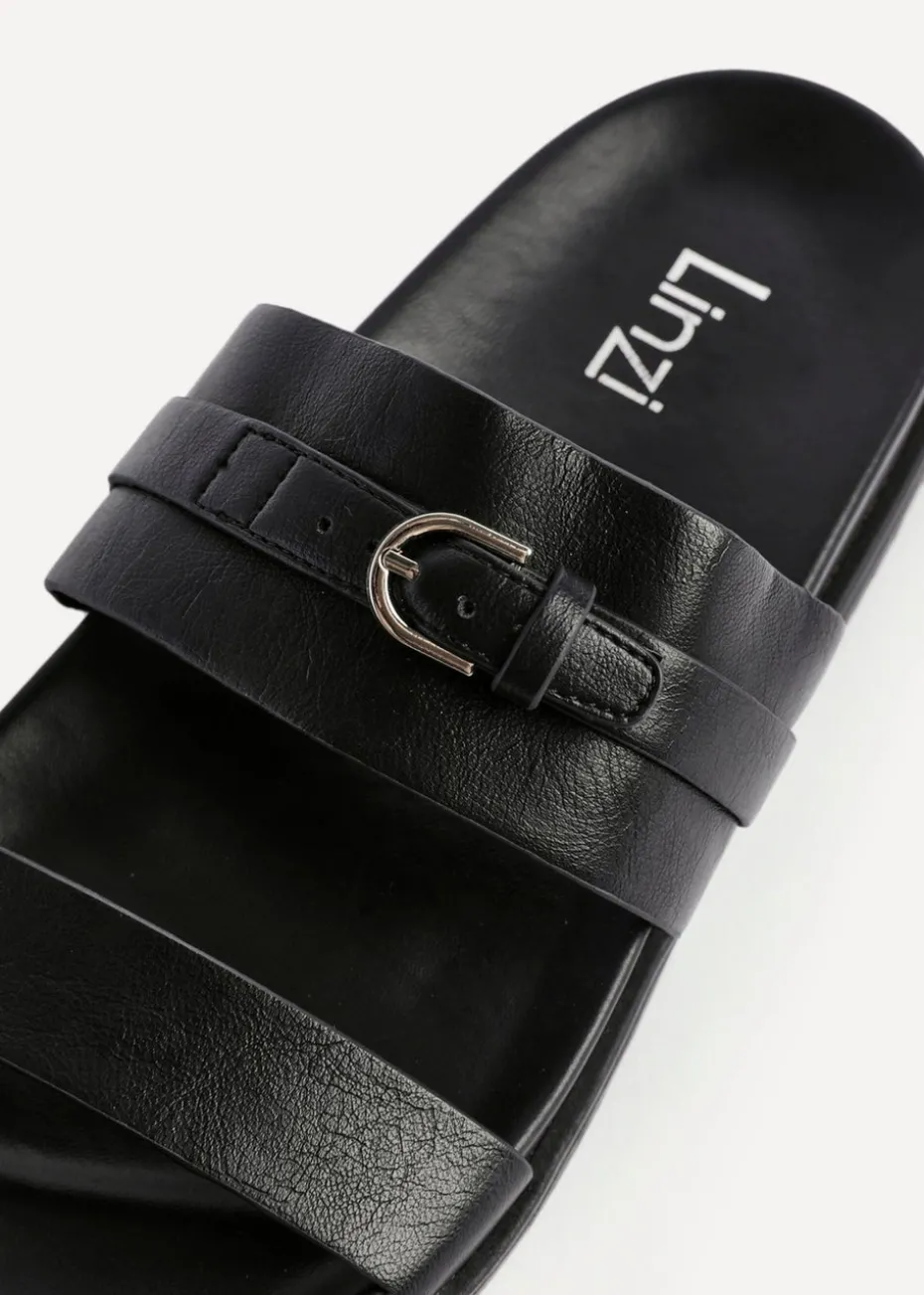 Be the first to review “Linzi Ezra Black Faux Leather Flat Slider Sandals” Cancel reply
