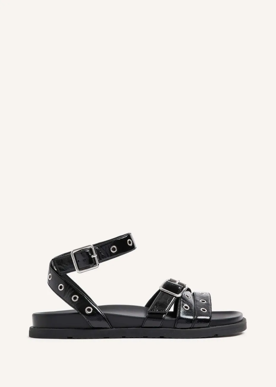 Laidback and stylishly chic, these sandals are crafted with a soft faux patent leather and adorned with silver eyelet details. Keep your feet comfortable all day long with the moulded footbed, and add a touch of fun to your Summer wardrobe with the playful front buckle detail and wrap around ankle strap..