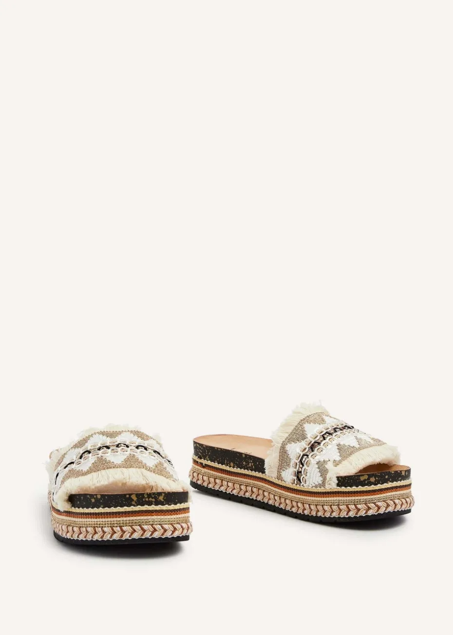 Introducing Janelle – a luxurious flatform slider sandal featuring a frayed, aztec stitched front strap and plaited rand detailing, with a 4.5cm flatform height. Elevate your style with this sophisticated and exclusive addition to your wardrobe..