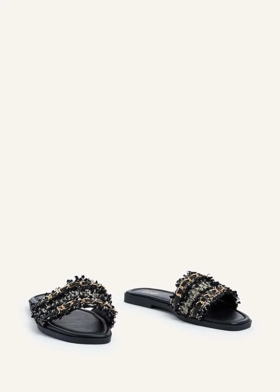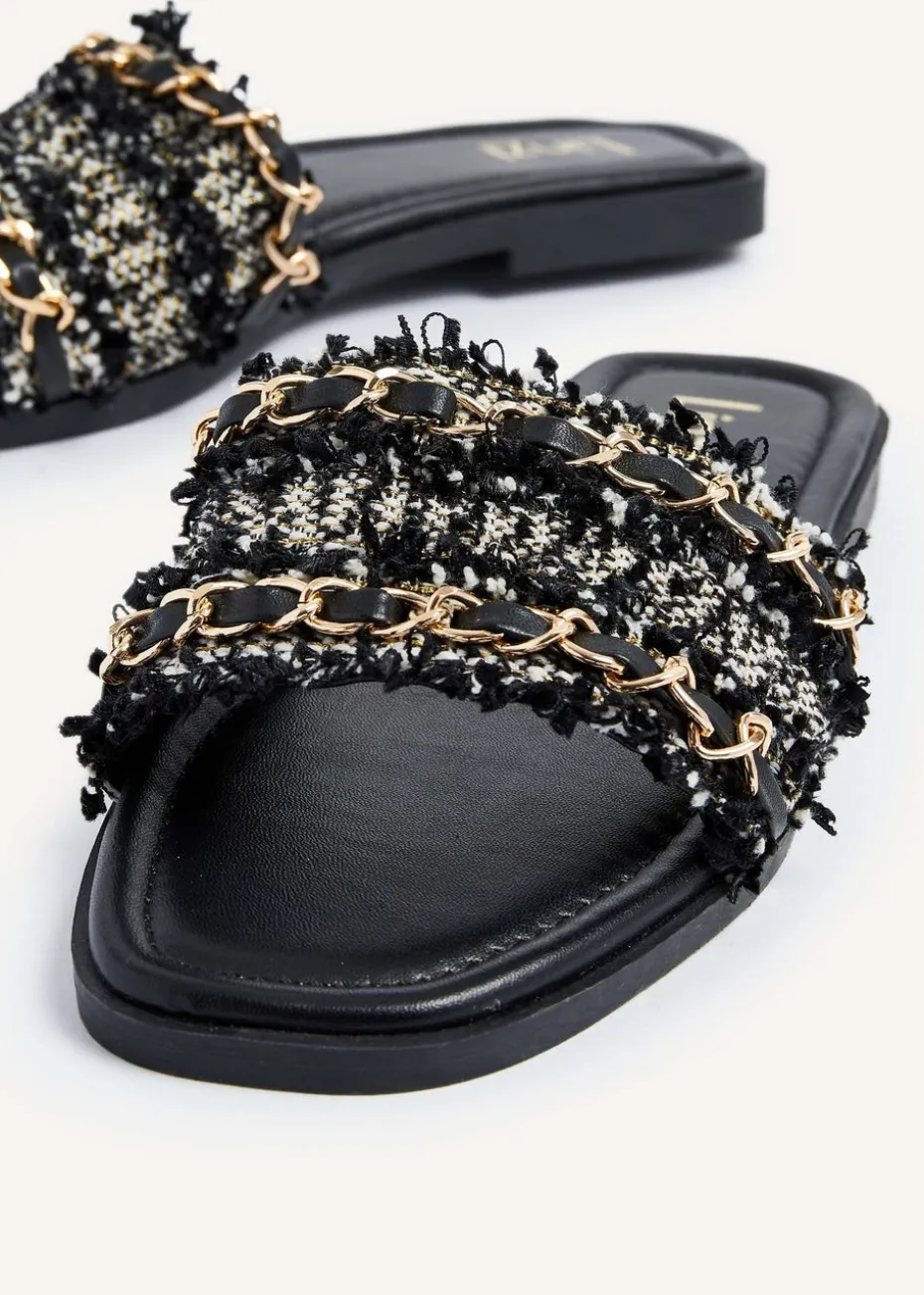 Indulge in the luxurious feel of our Faux Leather Frayed Chain Front Slip Ons, featuring a padded insole for ultimate comfort and a chic, statement-making chain detail..