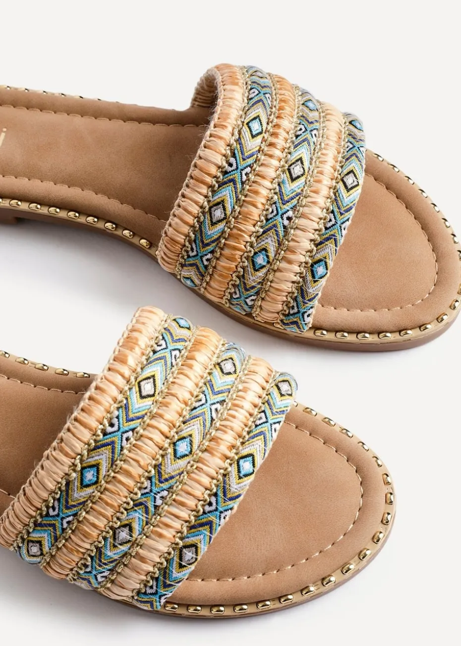 Step into effortless style with our Mariana flat slider sandals. Featuring a chic bohemian-inspired front strap with intricate woven patterns. The sole is embellished with metallic studs along the edge, adding a subtle touch of elegance and the cushioned insole offers all-day comfort.