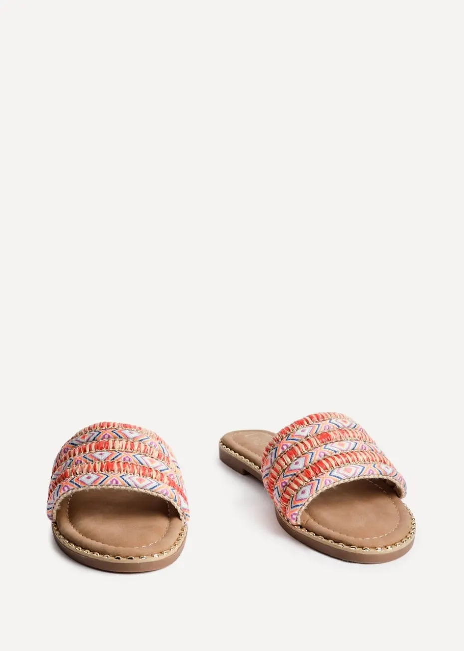 Step into effortless style with our Mariana flat slider sandals. Featuring a chic bohemian-inspired front strap with intricate woven patterns. The sole is embellished with metallic studs along the edge, adding a subtle touch of elegance and the cushioned insole offers all-day comfort.