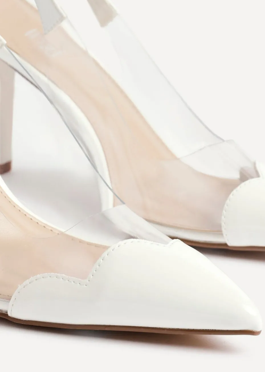 Our Nolita slingback court heels are designed to make a bold statement with their sleek pointed toe and mixture of perspex and patent fabrics. With a scalloped edge toe cap design, these slingback court heels are your new season to season wardrobe staple. They also include a cushioned insole that provide comfort without sacrificing style. Heel Height: 9cm.