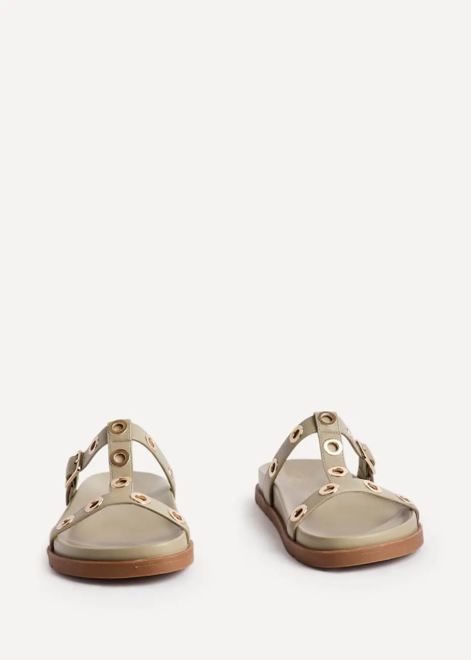 Discover our stunning Notice sandals, featuring a slip-on design with a T-bar strap with gold stud accents. Made with a plush and comfortable footbed, these sandals are perfect for all day wear.