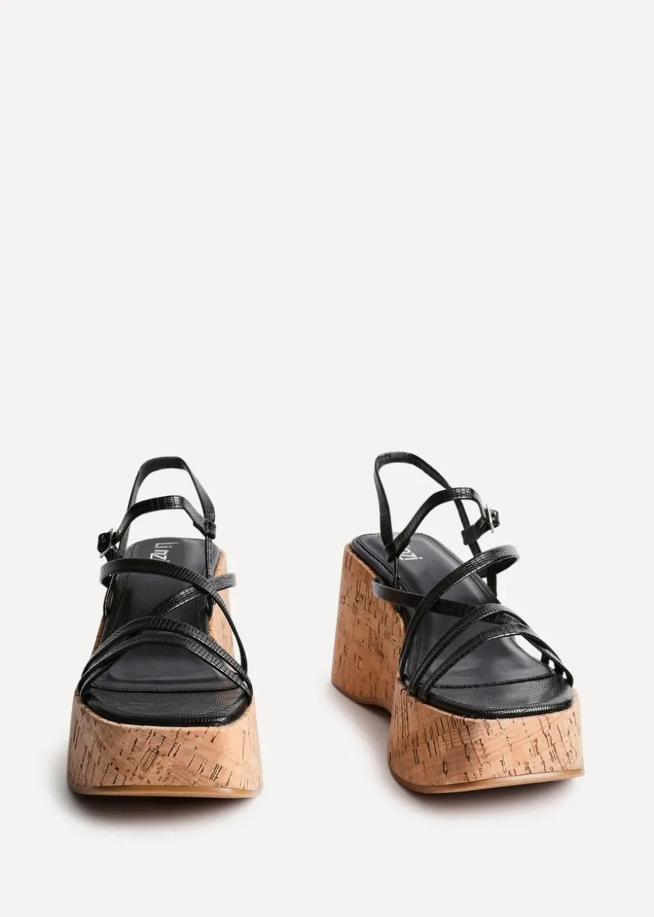 Be the first to review “Linzi Orbit Black Faux Lizard Strappy Cork Flatform Sandal” Cancel reply