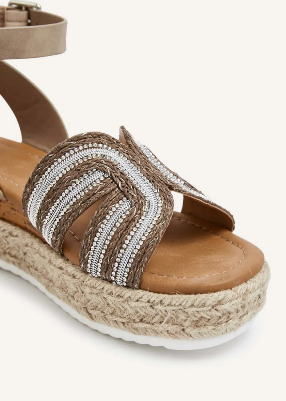 Our River wedges seamlessly blend a timeless espadrille-inspired design with a touch of glam. Featuring a link beaded detail front strap and a 5cm platform wedge offering height and comfort, making these wedges a perfect choice for a stylish statement.