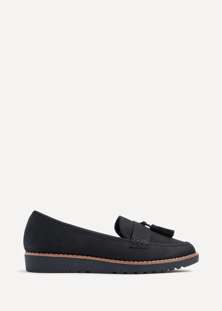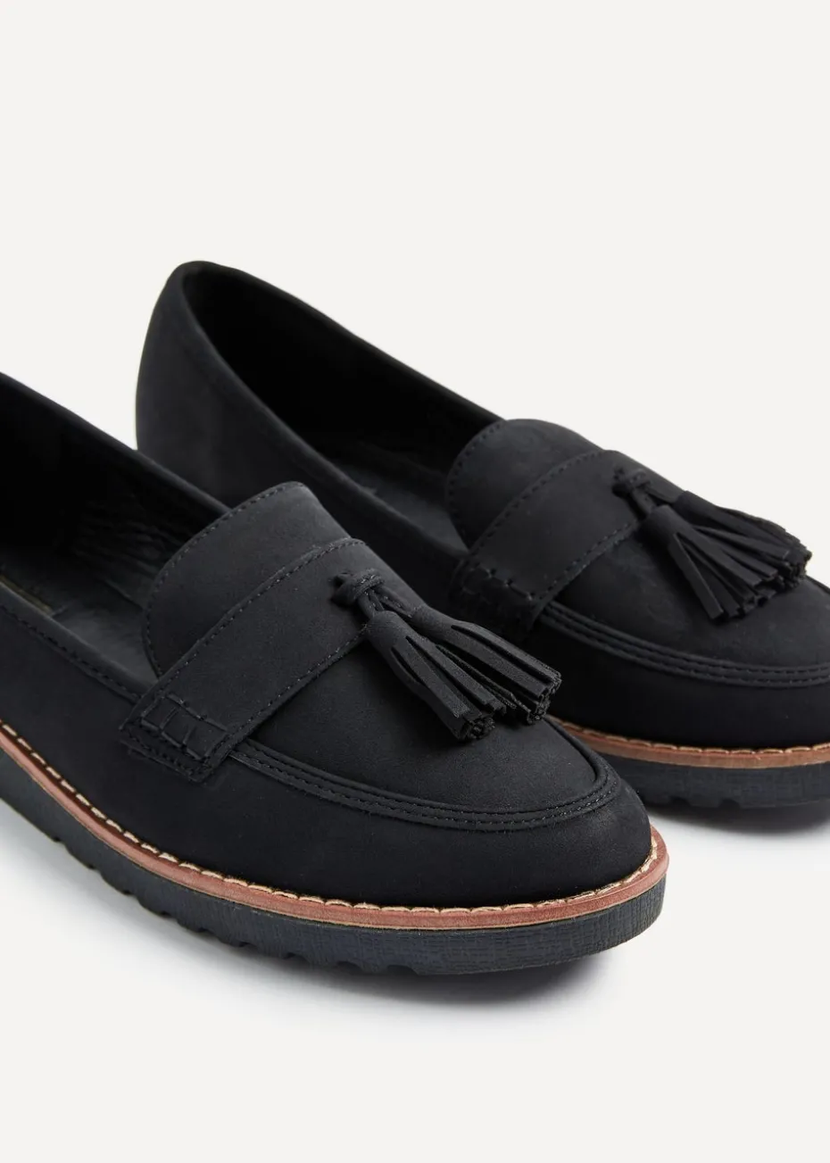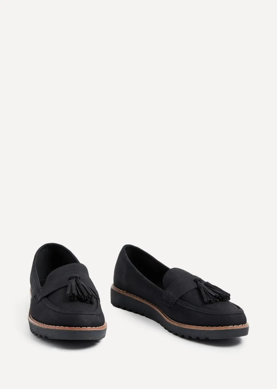 Soft Faux Nubuck Leather Classic Slip On Loafer Tassel Detail Brown Trim Rubber Cleated Sole.