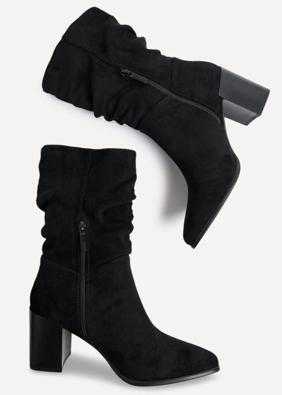 Soft Faux Suede Western Style Ruched Mid Calf Boot Leather Stacked Block Heel Pointed Toe Inside Half Zip Heel Height: 7.8cm / 3 inches.