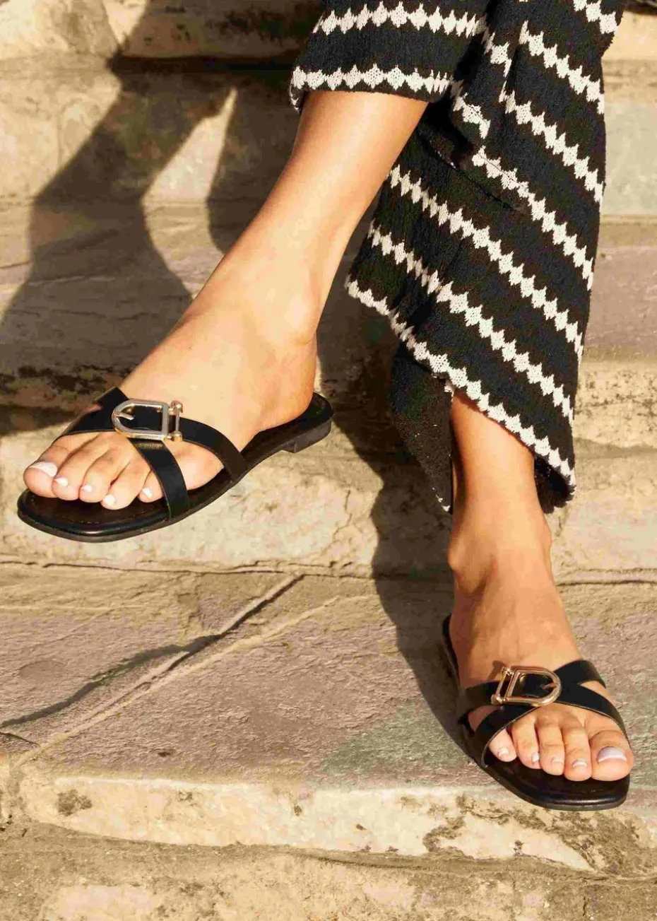 Reward your feet with style and comfort in these faux leather sandals. Step into a chic haven of relaxation and sophistication with the padded insock and sleek crossover front straps. Enjoy the warm weather and elevate your everyday look with the large gold buckle detail, adding a touch of luxury and exclusivity to your wardrobe..
