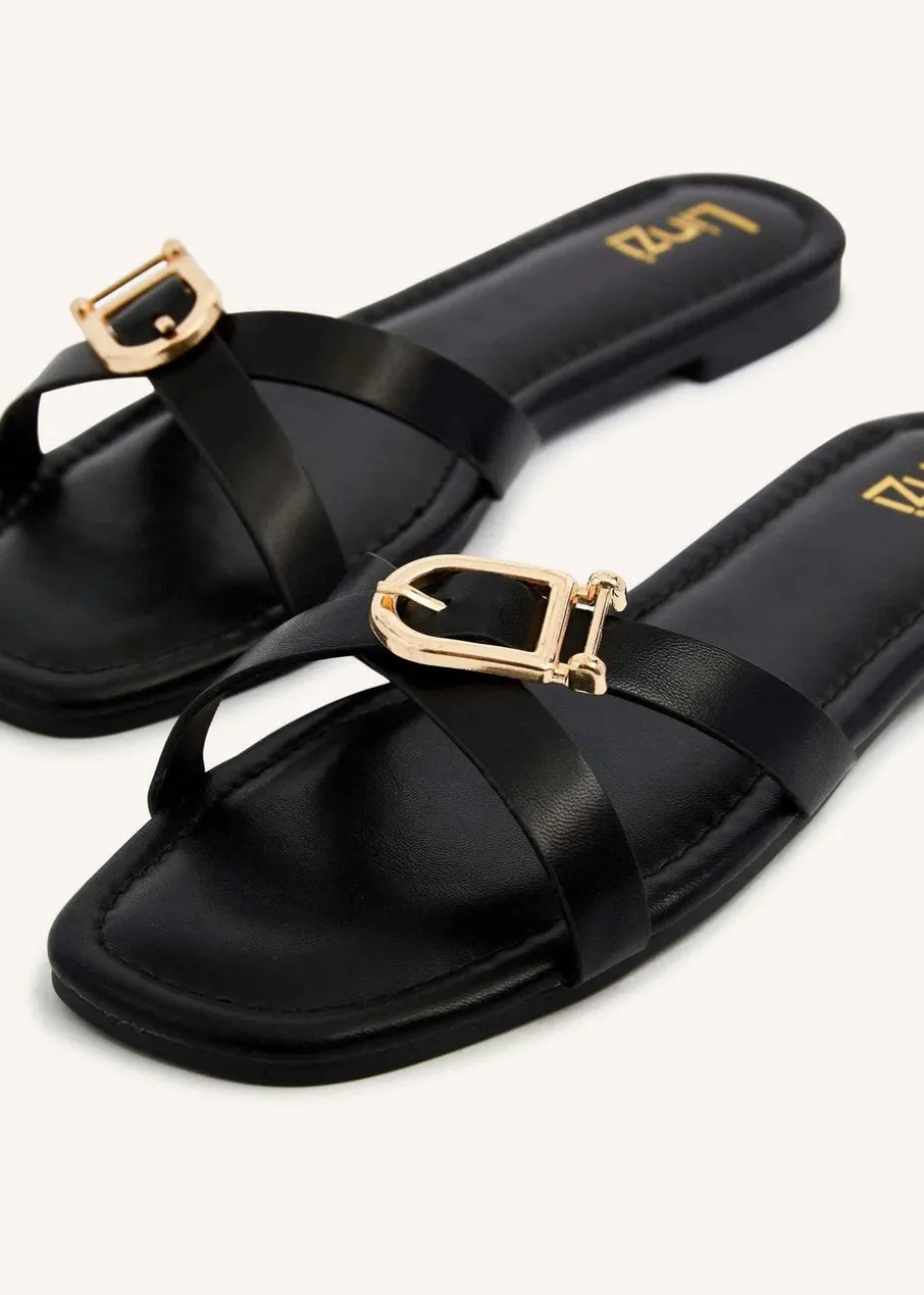 Be the first to review “Linzi Yasmin Black Faux Leather Crossover Slider Sandal” Cancel reply