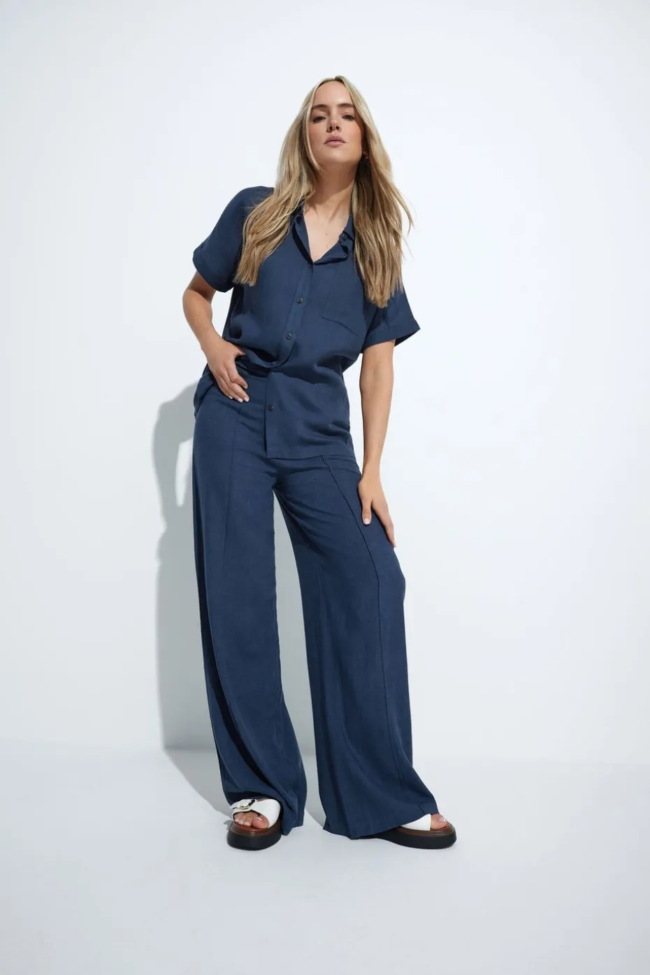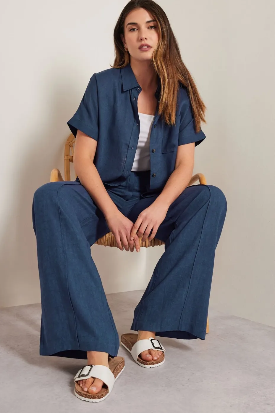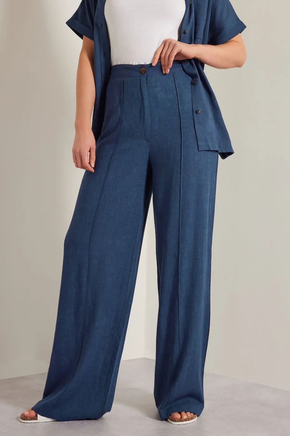 Long Tall Sally Navy Blue Linen Pleated Wide Leg Trousers