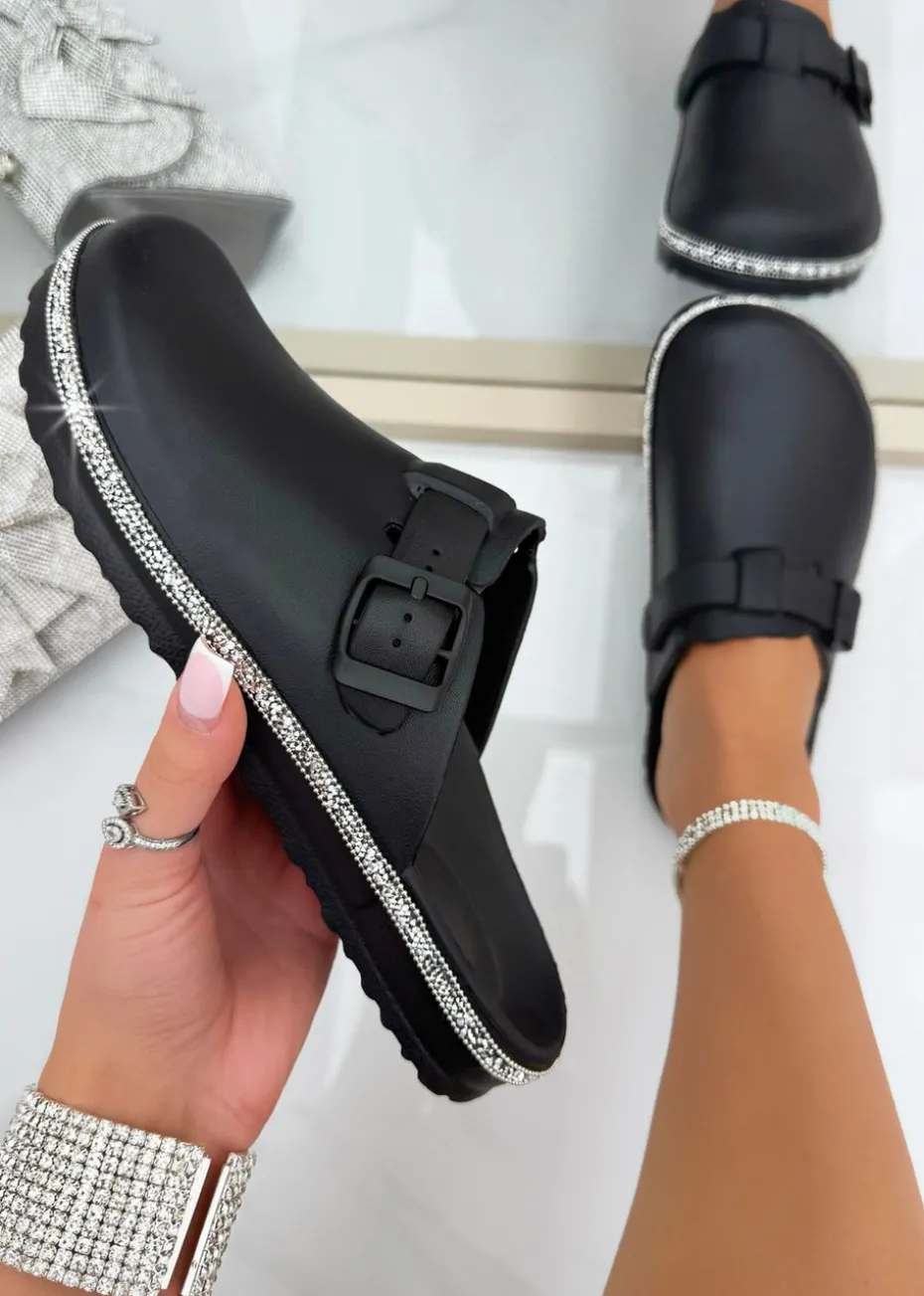 Designed for comfort and crafted with sparkle, these clogs feature a lightweight, flexible sole and are adorned with dazzling crystal accents that catch the light with every step.