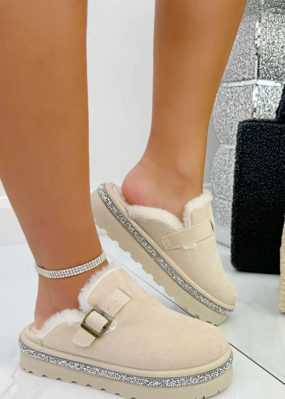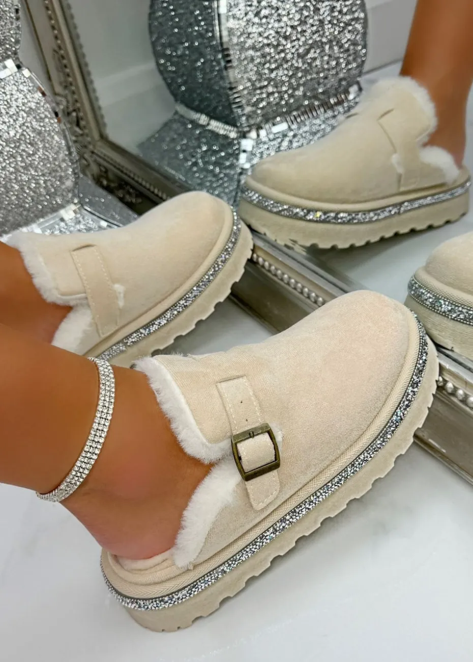 Finished with glittering crystal details, faux fur lining and a faux suede upper, style with our teddy tote bags for a chic autumn look.