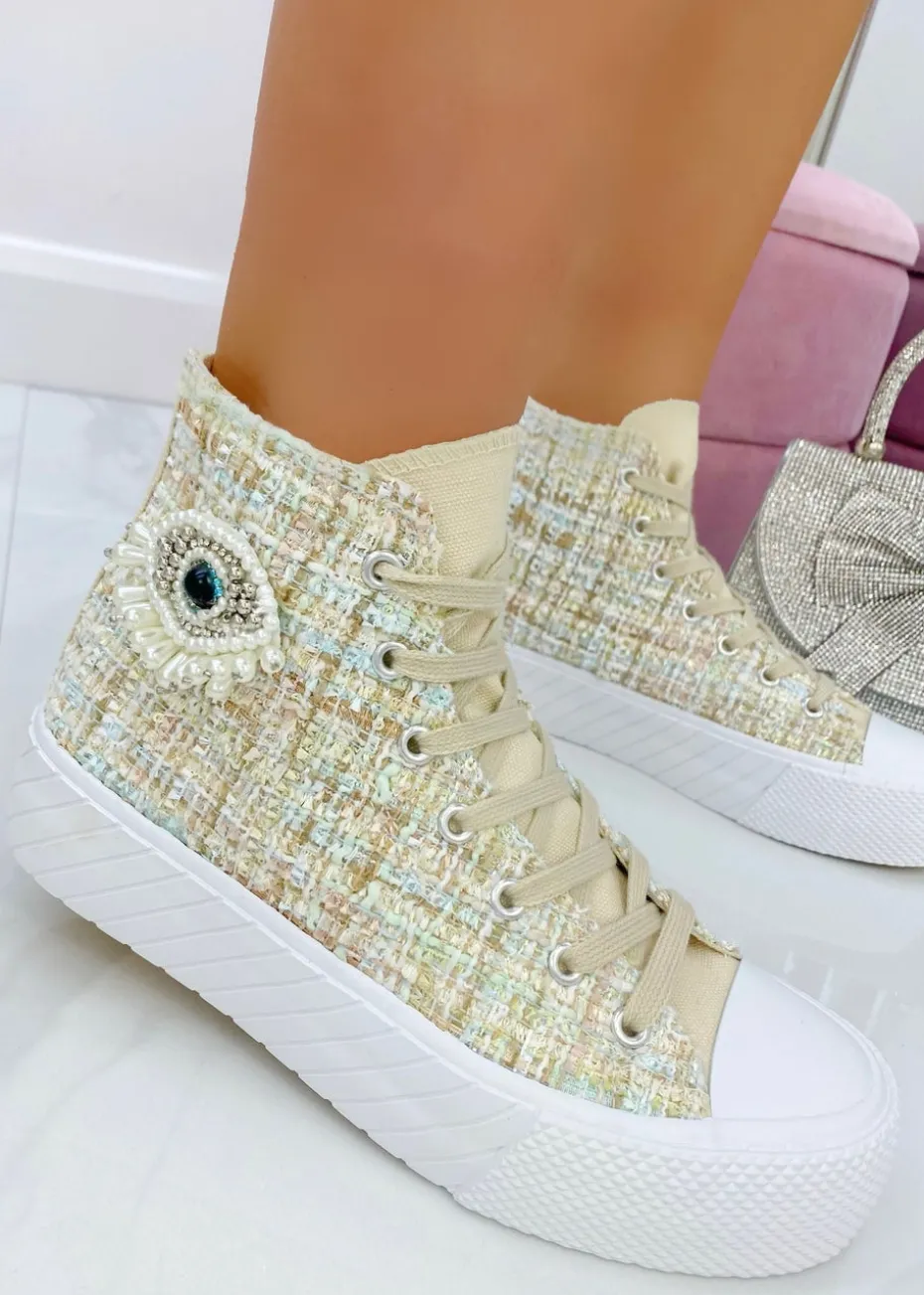 These eye-catching high tops feature dazzling crystal and faux pearl embellishments and a striking evil eye motif, symbolizing protection and positivity.