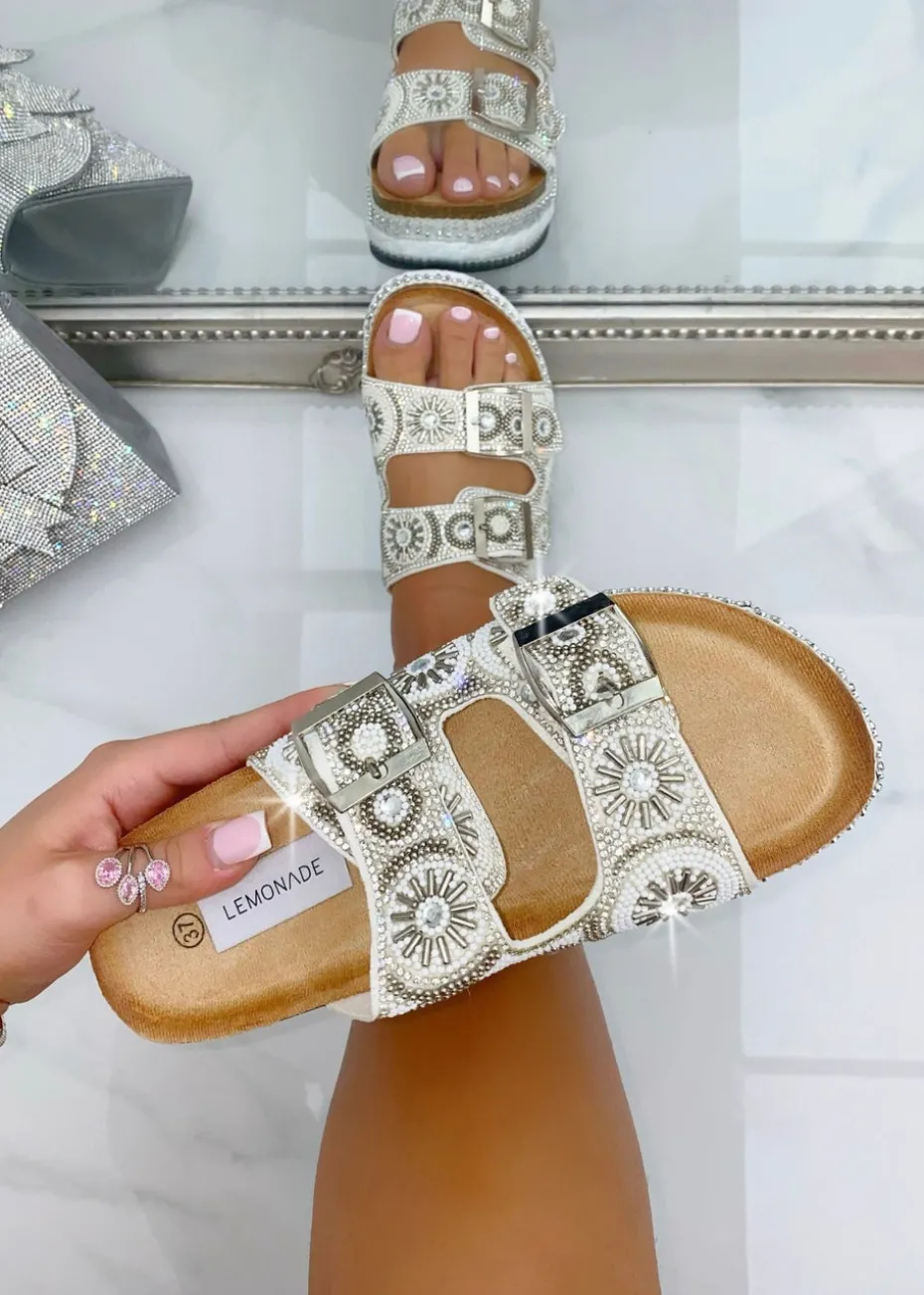 Designed to dazzle, these sliders feature two elegant straps, each embellished with radiant crystals that catch the light beautifully with every move.