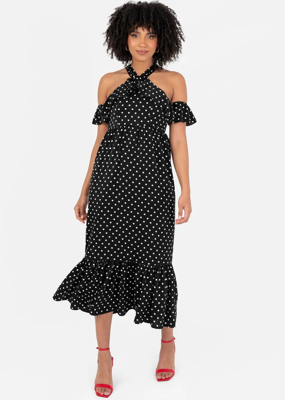 Timeless elegance meets modern charm in this stunning black midaxi dress, adorned with a classic white polka dot pattern. Featuring a cold-shoulder design and a flattering halter neckline, it exudes effortless sophistication. Ruffled layer cascades from the neckline, seamlessly blending into the short, elasticated sleeves for a soft, romantic touch. The tiered skirt enhances movement, making it perfect for any occasion. Whether you’re dressing up for a brunch date or a summer, pair this polka dot beauty with heeled mules for a flawless finish!