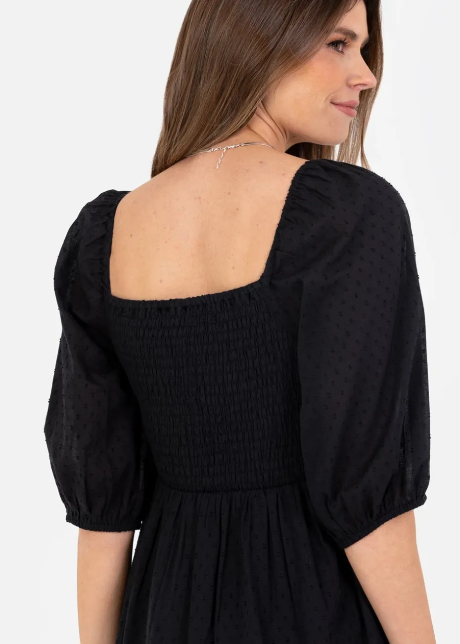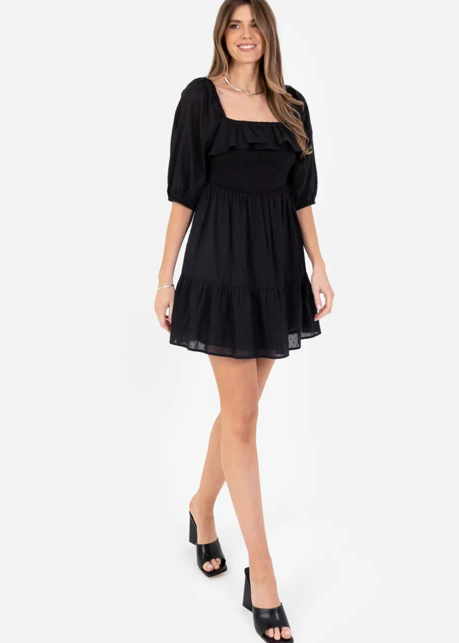 Classic dobby detailing meets a contemporary take on the skater silhouette. Crafted with an elasticated square neckline and short puffed sleeved the shirred bodice is further framed by charming ruffle that gently falls from the neckline. Defined waistline and flared mini skirt complement all body types and allows you to mix and match your outfit to perfectly match the day’s activities. For a day to day look style with tights and boots or for a fun evening event pair with a pop of your favourite colour!