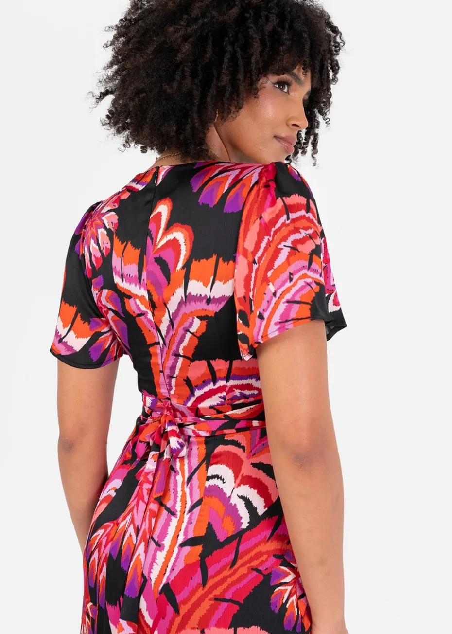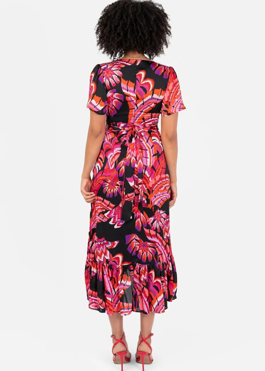 Make a bold statement with this stunning floral dress, perfect for a tropical getaway, summer wedding, or evening soiree. Designed for effortless elegance, it features a vibrant tropical floral print set against a sleek black base. The V-neckline bodice is complemented by delicate short angel sleeves, adding a soft, fluttering touch. A cinched waist flatters your figure, while a cascading waterfall ruffle flows from the side, shaping a faux wrap-style skirt with a ruffled high-low hem. For the perfect finishing touch, attached waist ties fasten into a charming bow at the back, enhancing the dress feminine appeal. Complete the look with black strappy heels and statement earrings.