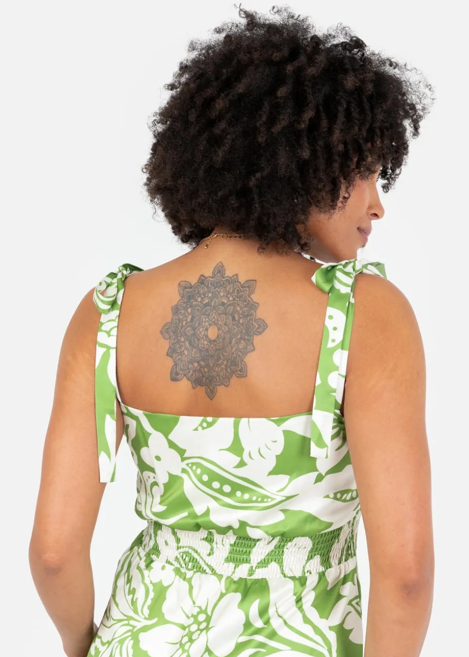 Step into effortless summer style with our Strappy Midaxi dress. Crafted from lightweight satin, this dress drapes beautifully for an elegant yet breezy feel. The refreshing green base with a cream floral pattern exudes timeless charm, while the adjustable tie straps and ruched bust detail ensure a flattering fit. A ruffled tiered skirt adds graceful movement, making it the perfect choice for garden parties, beach holidays, or casual brunches. Pair it with strappy sandals for a relaxed daytime look or dress it up with heels for a chic evening ensemble.