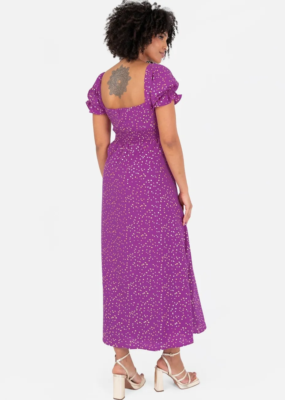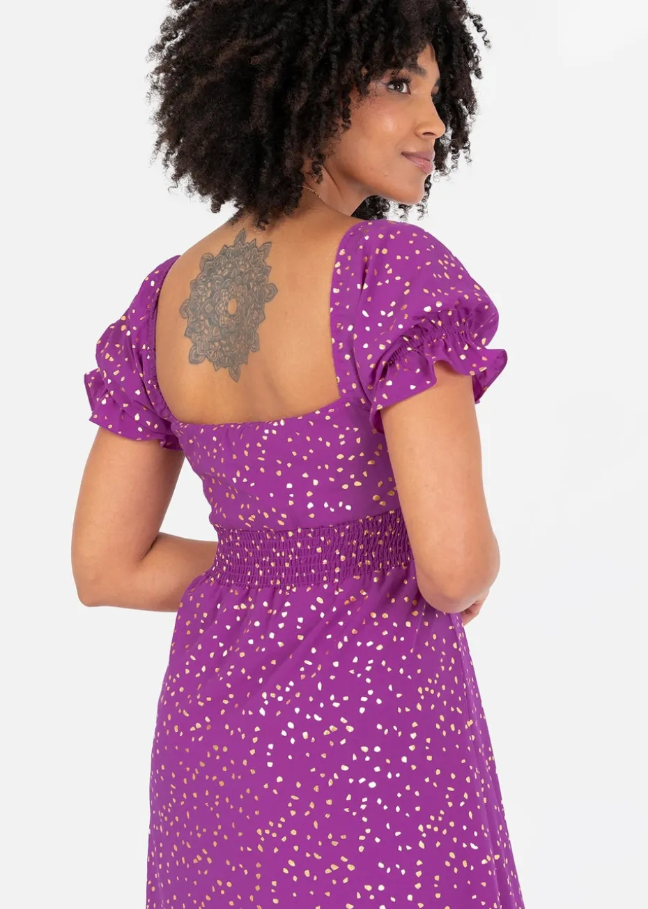 This enchanting dress features a radiant purple base adorned with a shimmering metallic gold speck pattern, creating a mesmerizing visual effect. Designed to flatter, it boasts an empire waistline that enhances your silhouette, complemented by a delicately structured bust resembling a bow. Elasticated shoulders and short puffed sleeves add a romantic touch while ensuring both comfort and style. For an extra dose of elegance, the dress is finished with a flowing skirt and a subtle split, allowing for graceful movement and a sophisticated look. Perfect for special occasions or evenings out, it pairs beautifully with gold heels and an elegant updo.