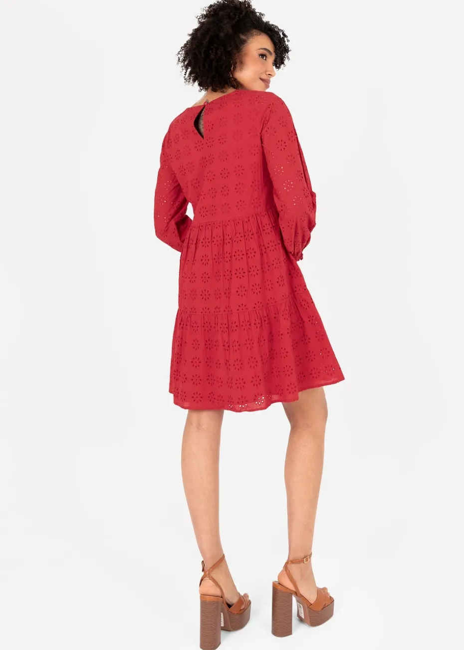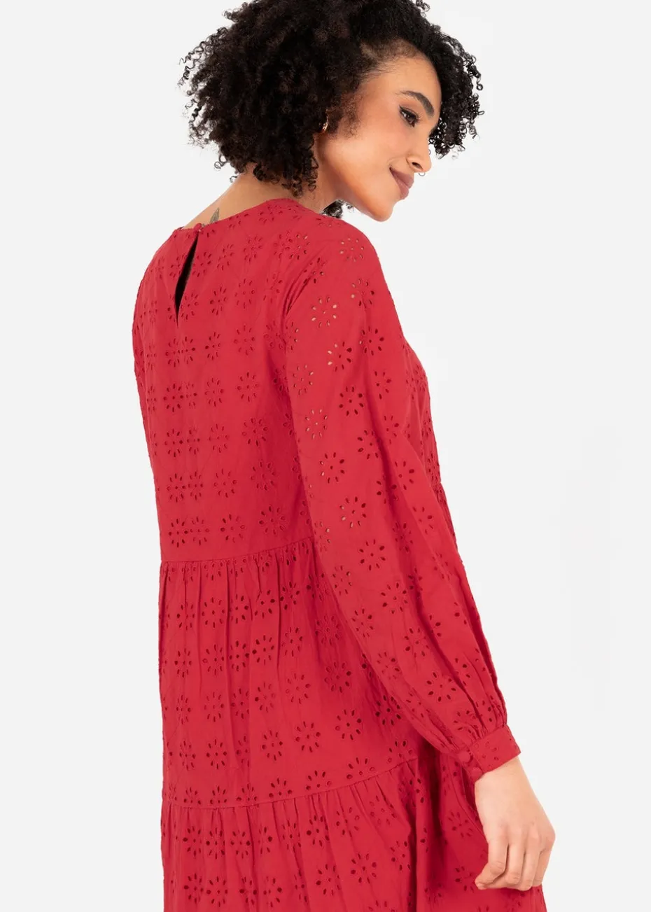 Cute and playful this red dress is our new favourite this season! Crafted from breathable cotton fabric that’s adorned with delicate floral cut outs decorated with subtle embroidery this mini presents a versatile and feminine style. Smocked silhouette on this long sleeved mini creates a relaxed fit perfect for dressing up for an evening soiree or dressing down for a casual work ensemble.